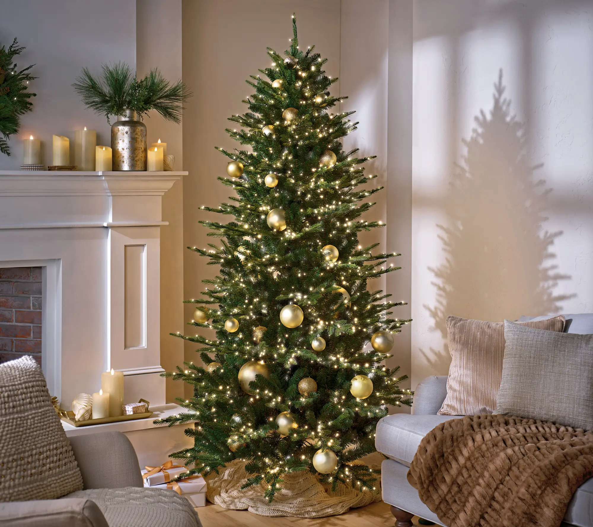 This 8.5' Micro LED Tree with 3-in-1 Lights and Bag features 18,- functions, 8/24-hour timer, measures 56" diameter, 4173 branch tips, and 3000 LED lights. Lighting functions include Steady, Sparkle, Sparkle Color Flip, Fade, Color Flip, Color Flip Fade, Flicker, and Light Show. Light dimming features included.- App with Bluetooth capability available for download. Remote requires 2 (AAA) batteries. CSA Listed. Imported.