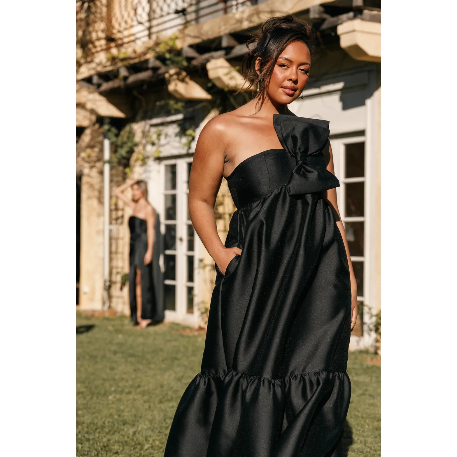 Never have I ever loved a dress this much. Black tie / gala / wedding guest dress. Pockets! Adjustable strap, large front bow. It's stunning with an old money shape. Wearing an XS (5'3 size 4) #weddingguestdress #formaldress #blacktiedress #formalgown #holidaydress