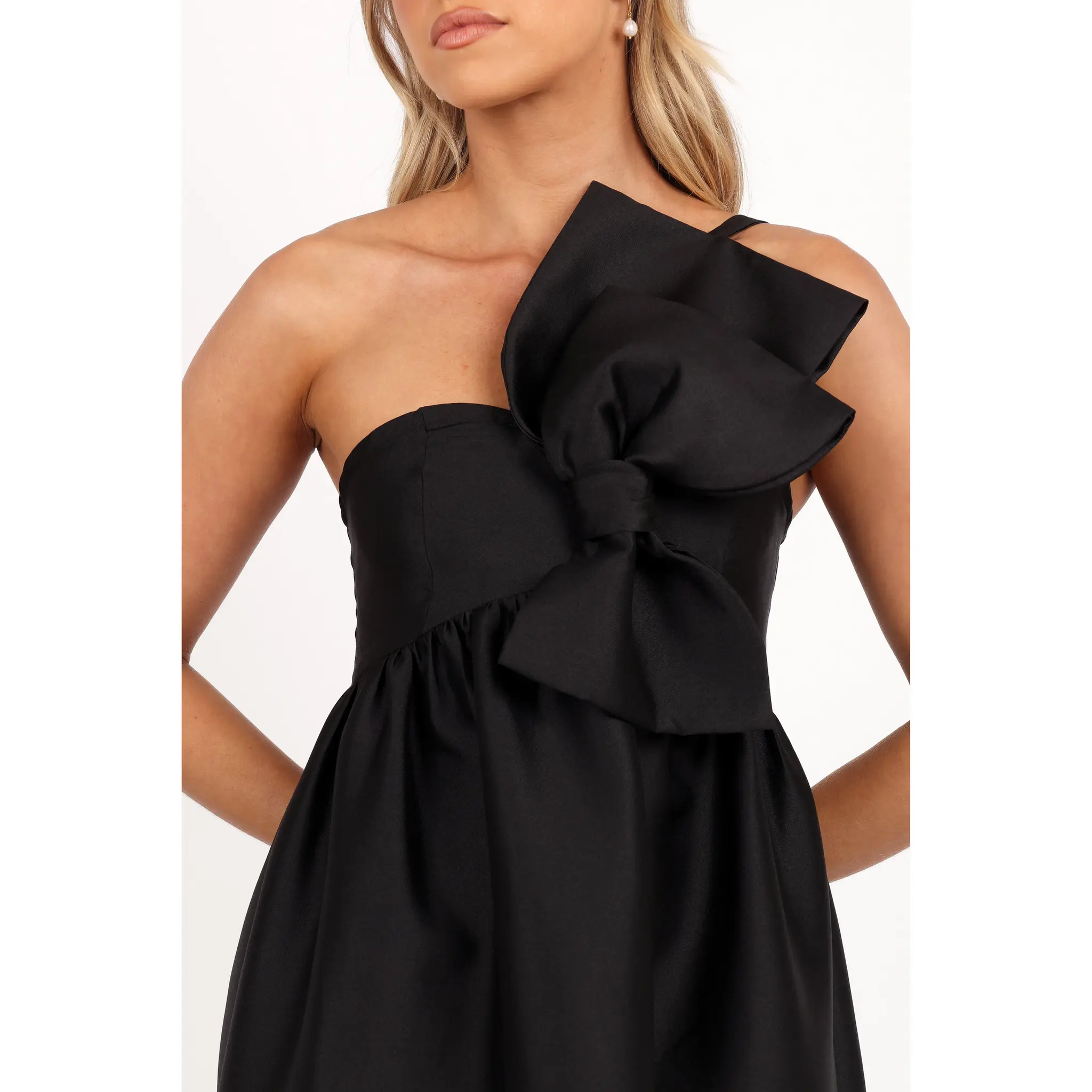 This fashion-forward piece showcases a playful one-shoulder design with an adjustable strap for a perfect fit. Our sleeveless gem features a non-detachable bow, adding an irresistible touch of charm. But that's not all! It also comes with functional side pockets for a dash of practicality.