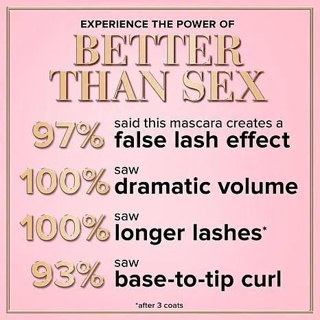 Too Faced Better than Sex Volumizing & Lengthening Mascara What It Is Prestige, high-performance mascara for lasting wear.  What You Get  .27 oz Better Than Sex Mascara What It Does Film-forming polymer for smudge-proof, all-day wear  Complete formulation helps moisturize and thicken the appearance of lashes and helps lock curl in place Provides a deep, intense black  Consumer Perception Survey In a recent consumer perception survey of 31 subjects that applied three coats of Better than Sex Mascara daily for one week, the following was found: Day One (first use):    • 100% felt their lashes appeared longer    • 100% felt the mascara thickens lashes at the base and lengthens at the tip Week 1:    • 100% felt this mascara provided dramatic volume and length    • 90% felt that they love this mascara  How to Use Sweep on one coat for lashes that are full, defined, and stretched to unbelievable lengths Add two coats for lashes that look even more luscious, curled, and dramatic Brush on three coats to achieve the most voluminous, multidimensional lashes possible Made in Italy