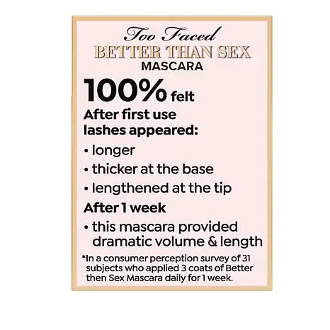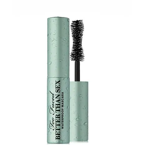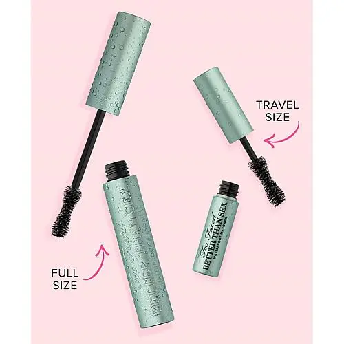 Too Faced Better Than Sex Waterproof Mascara Travel Size What It Is Mascara with high-performance, water-resistant polymers for waterproof, smudge-proof, all-day wear. What You Get .17 oz Better Than Sex Waterproof Mascara What It Does Contains porcelain flower extract, omega oil and other key ingredients to moisturize and condition lashes Has peptides for a deep, intense black color Hourglass-shaped brush unlocks the collagen-fueled formula How to Use Sweep on one coat for lashes that are full, defined, and stretched to unbelievable lengths Add two coats for lashes that look even more luscious, curled, and dramatic Brush on three coats to achieve the most voluminous, multidimensional lashes possible Made in Italy