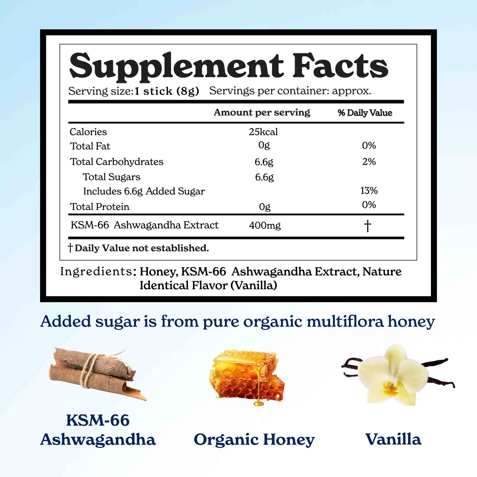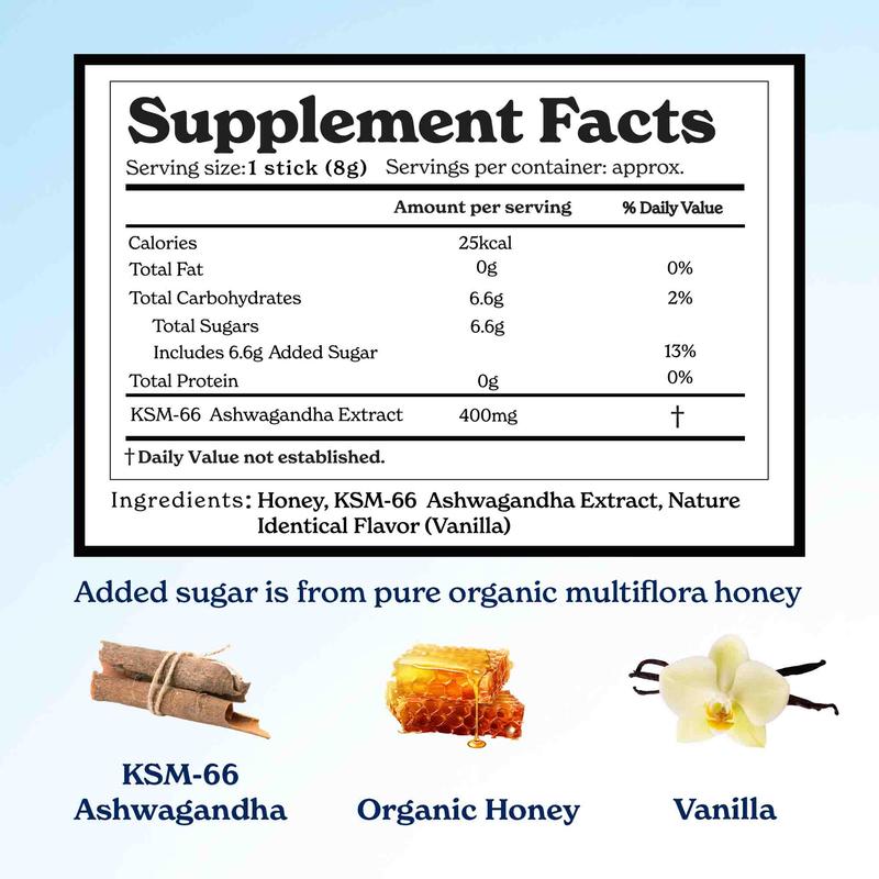 ·These honey sticks combine the power of 400 mg of KSM-66 Ashwagandha with organic Himalayan multiflora honey and a touch of natural vanilla flavor to help promote relaxation, improve focus, and support restful sleep.*