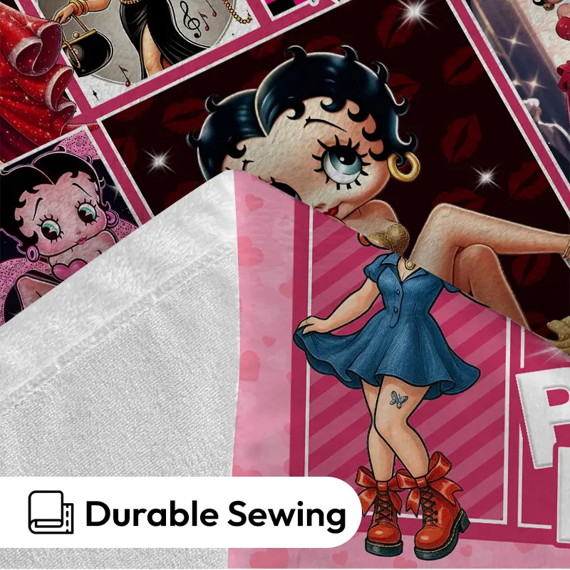 Choose from sizes: 40x50, 50x60, 60x80 inches. Material: Polyester. These versatile blankets are soft and lightweight, suitable for various uses. Enjoy year-round comfort with Betty Boop Blankets.