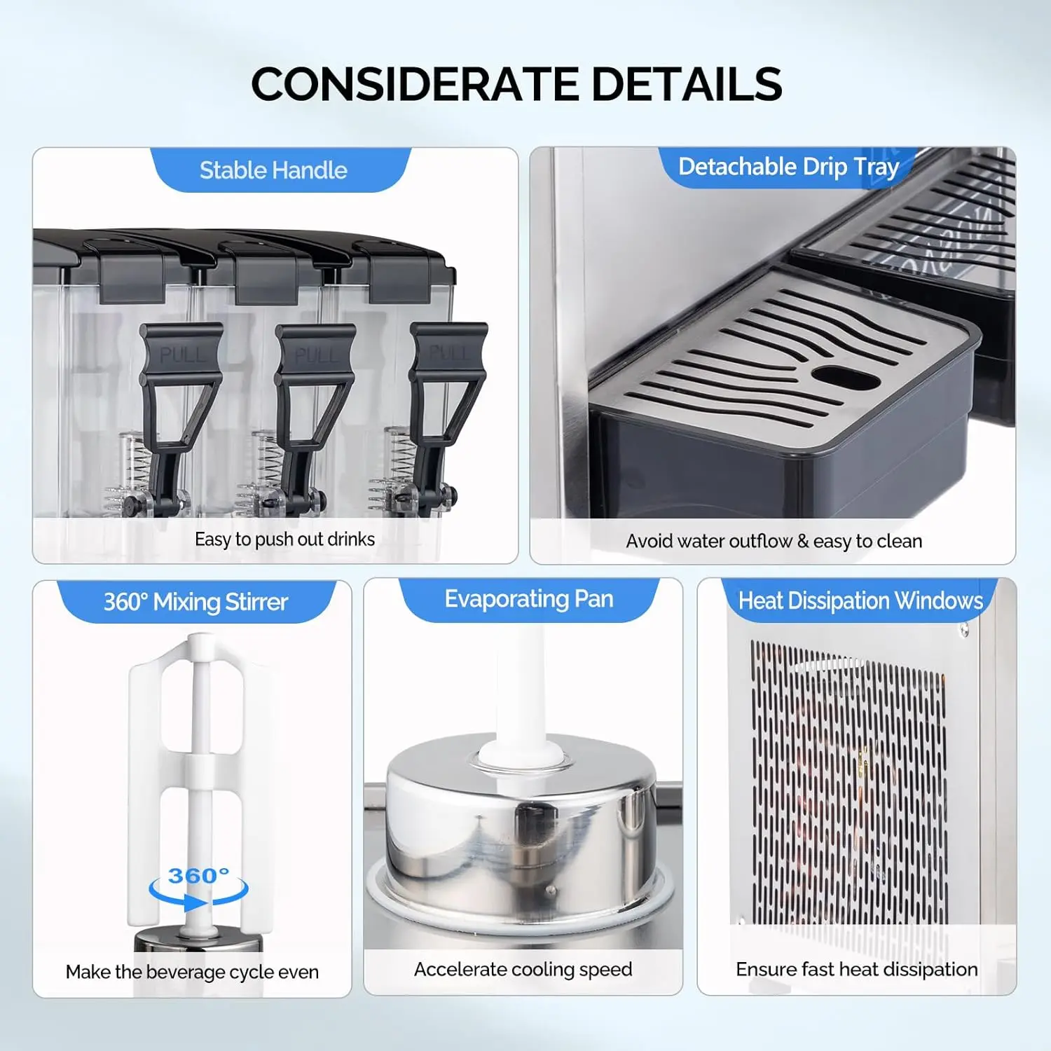 Included in the package:A double-cylinder 3*10L commercial juice dispenser