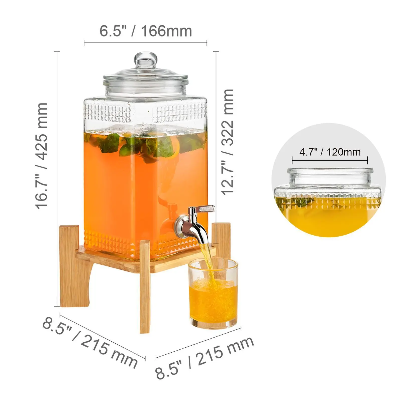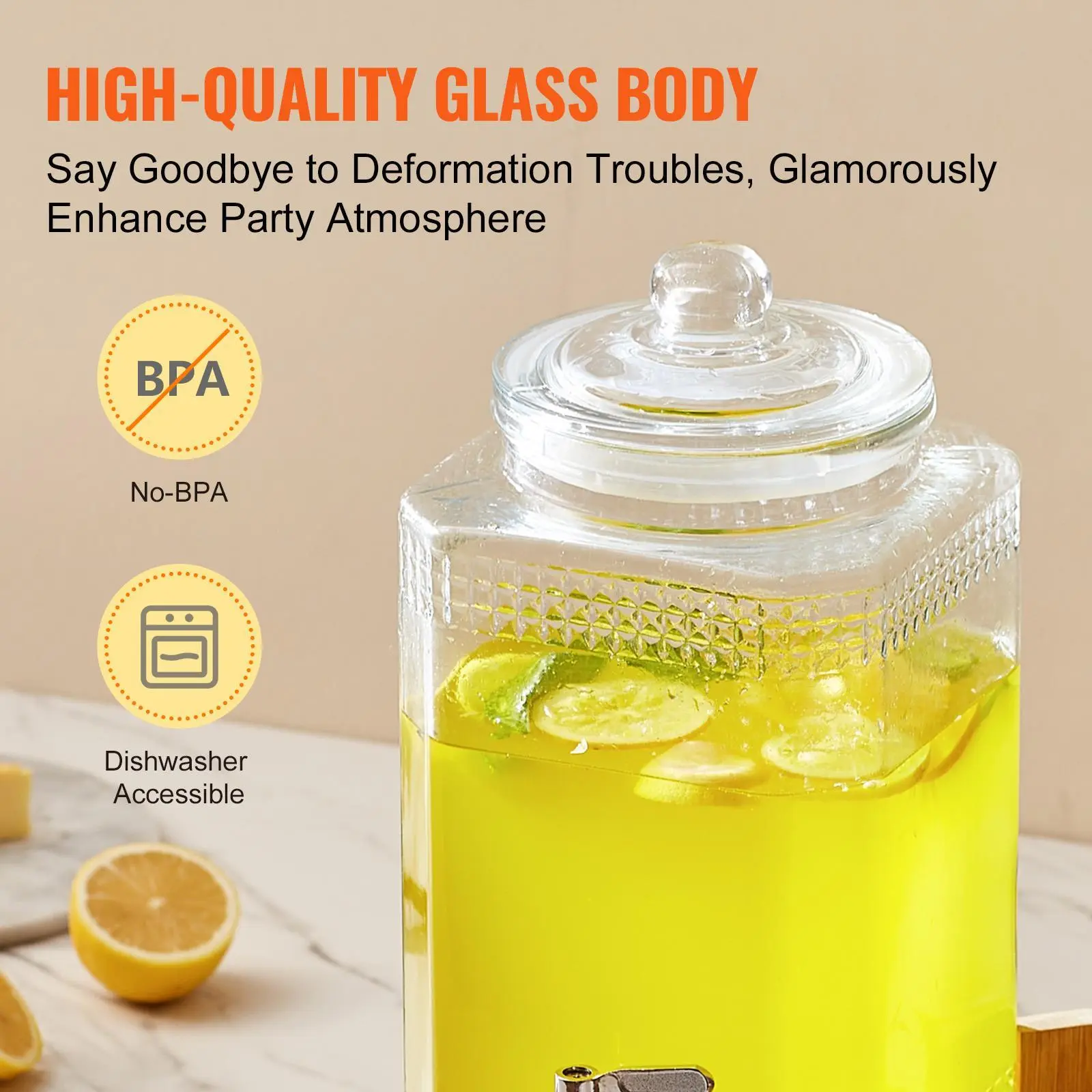 • Selected Food-grade Glass Material: The beverage dispenser is made of high-quality glass, more durable and stable! Add ice cubes at will, chilled beverages without worrying about deformation or breakage. It's also stain-resistant and durable, no more worries about hard-to-clean containers! Simply soak or put it in the dishwasher to easily clean.