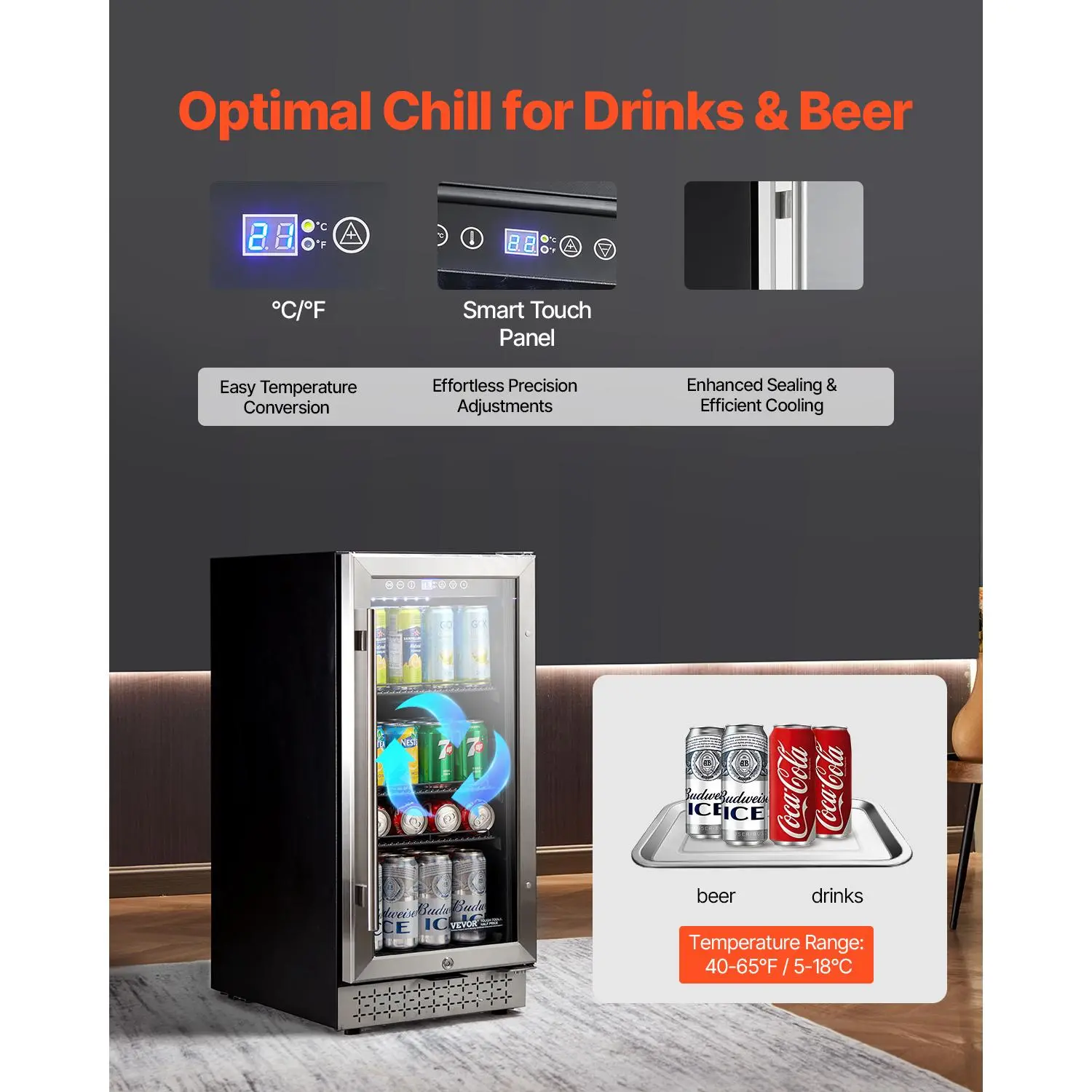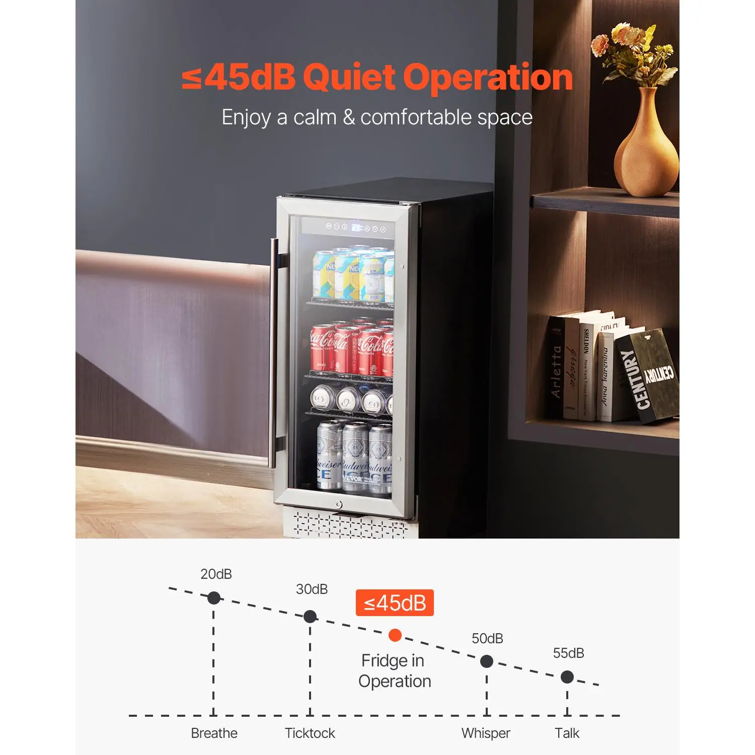 • Low-noise Functionality: Equipped with a premium compressor and fan, this beverage fridge with glass door operates at a noise level of ≤45 dB. Enjoy an undisturbed environment as it works silently to keep your drinks chilled.