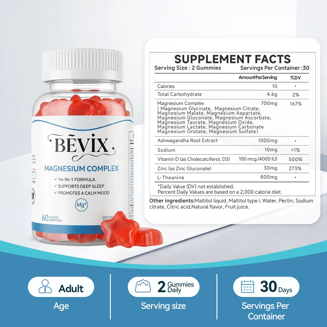 ·14-in-1 Formula: BEVIX Magnesium Gummies feature 12 forms of magnesium plus Ashwagandha, L-Theanine, Vitamin D3, and Zinc to support calm, focus, and daily balance. Designed to help maintain cortisol levels and promote mood resilience without melatonin.