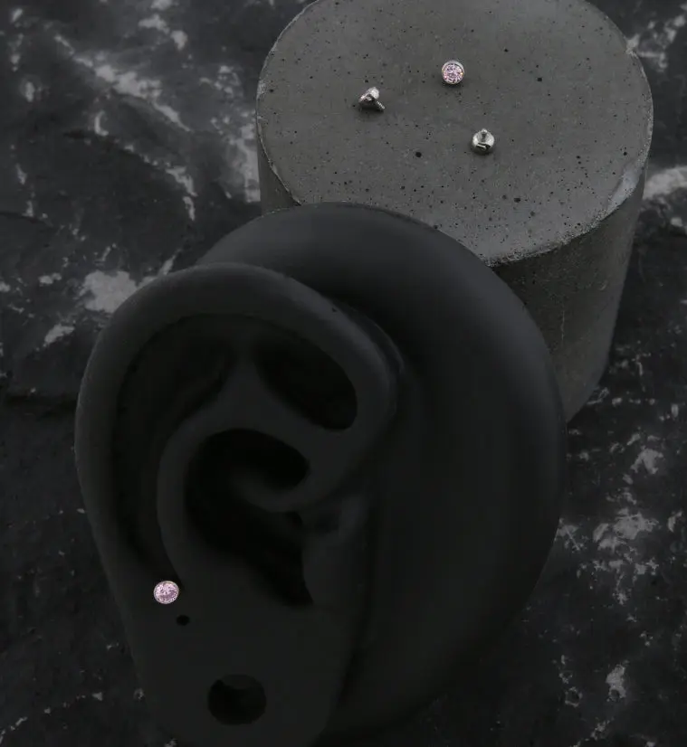 Pretty internally threaded top piece to add to your piercing! Made from durable ASTM F-136 titanium with light pink CZ gems, this internally threaded top works with 16G piercings. Gem size is 3mm. The 16G features an M0.8 threading. Sold individually (1pc).