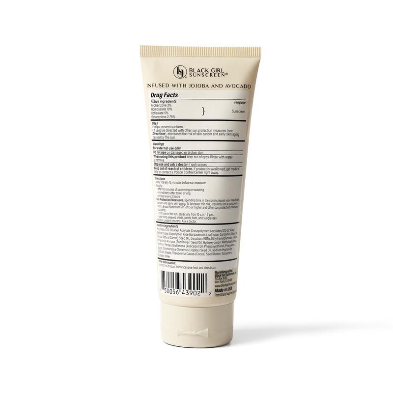 Black Girl Sunscreen Vanilla Crème SPF 30 Lotion for the face and body is infused with Aloe Leaf Juice, Carrot Seed Oil, Sunflower Seed Oil, Avocado Oil, Jojoba Seed Oil, and Cacao Seed Butter to help moisturize, soothe and heal your skin while providing a natural finish and delectable vanilla scent.