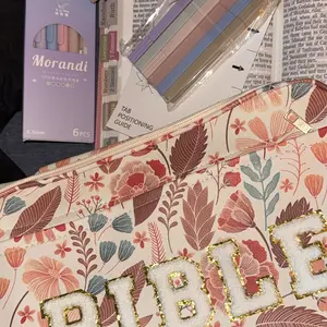 Christian Bible Bag with Floral Patterns PU Leather Bible Case with Aesthetic Annotation Kit Chenille Letter Bible Case Bible Study Supplies Easter Gift for Christian Mom Women Girls, Church Sunday Prayer Bible Journaling Kit