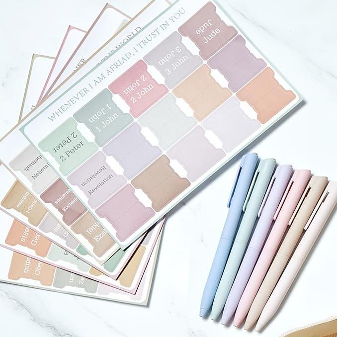 Love the kit! Exactly as pictured. Reviews said that some markers show up transparent so I knew what to expect from the light 4. Obsessed W/transparent sticky notes. The pens don't work on them you must use marker but you can read through them just fine. Warning: highlighters do bleed through Bible
