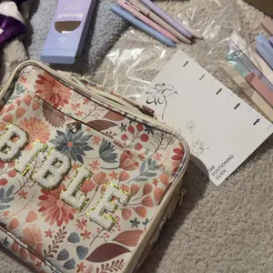 Love it ! I’m so happy I was finally able to get this pattern , it’s so pretty . 12 highlighters , 6 colorful pens , Bible tabs, & the bag is made of leather-like water resist material . I’m so excited to study . Material: Leather like.