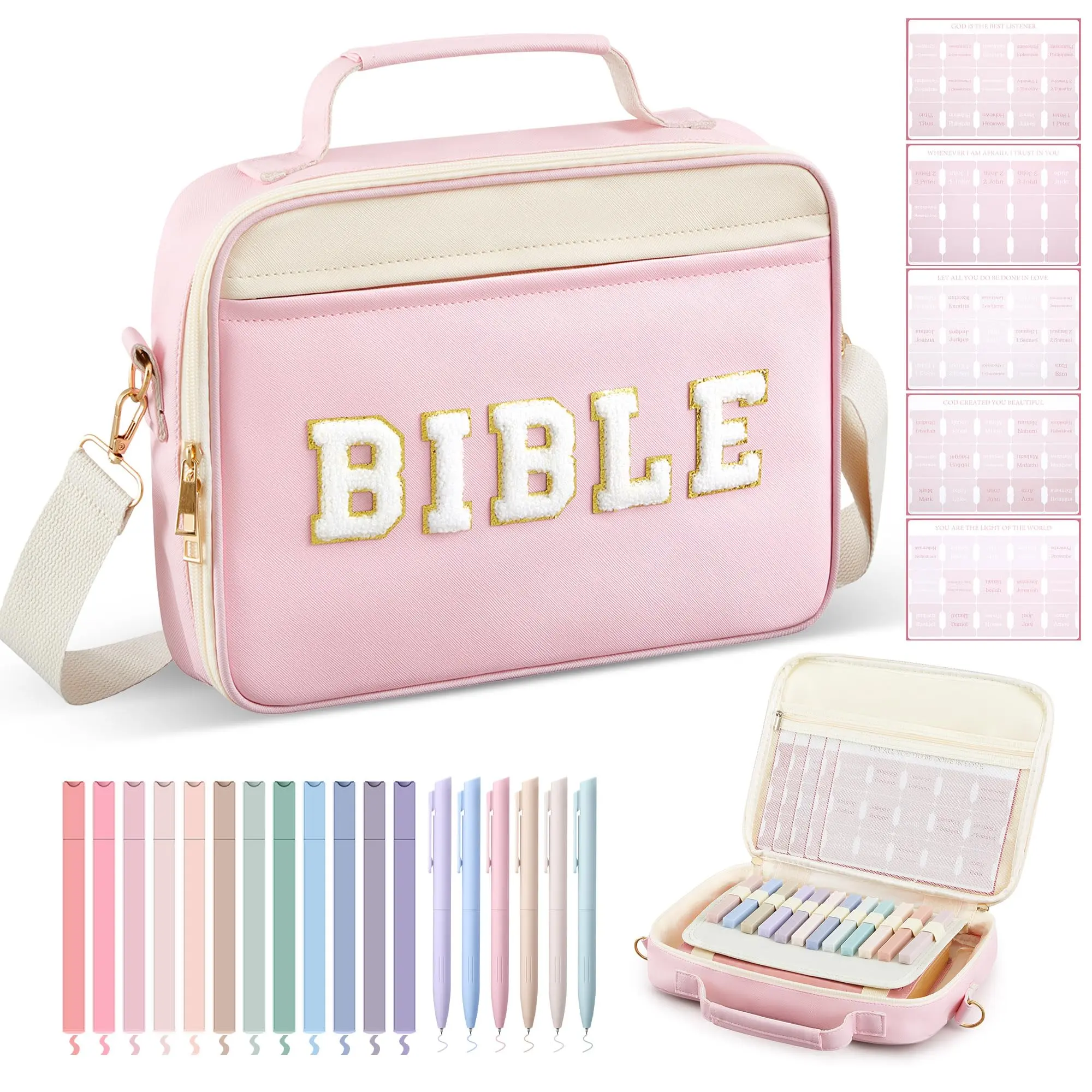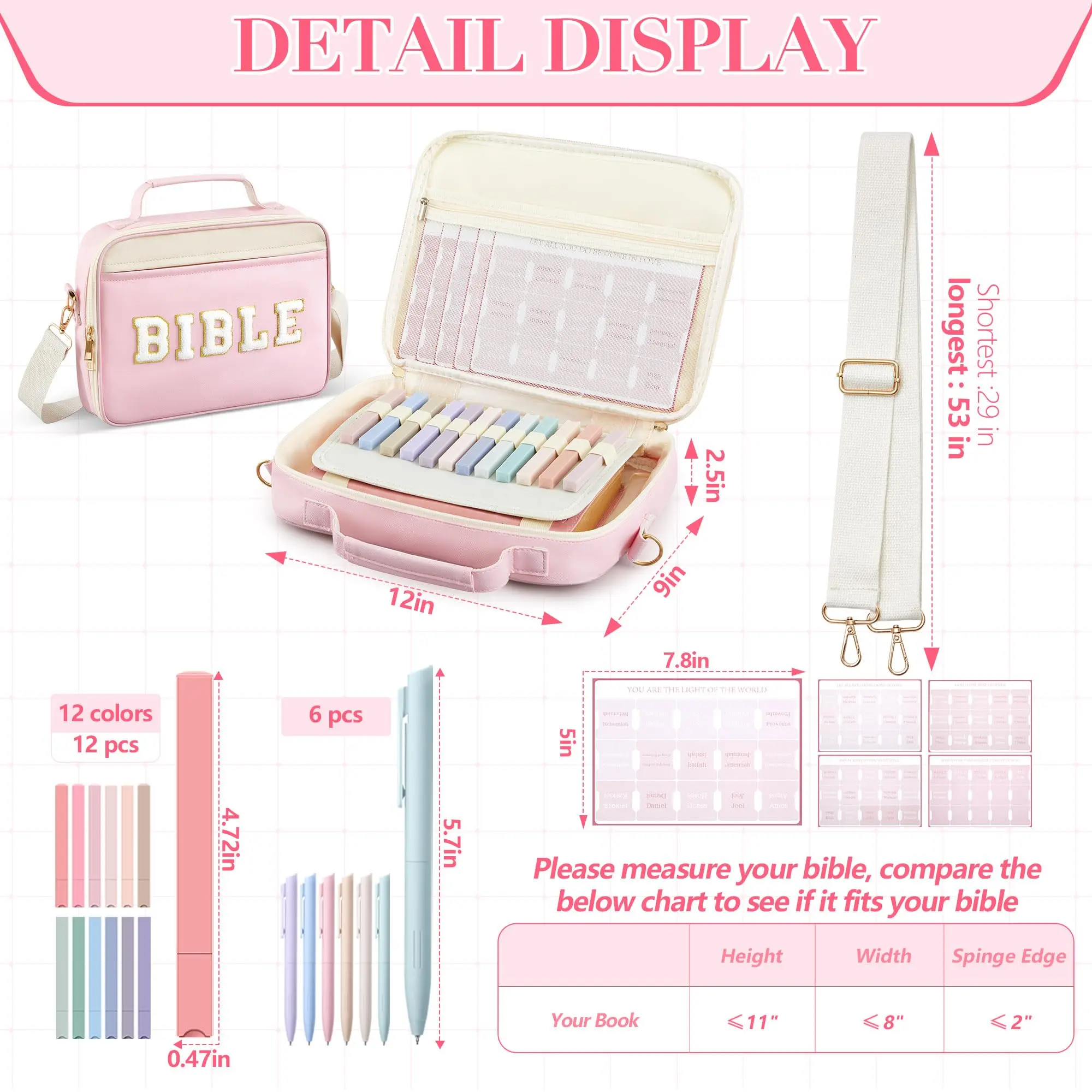 Every set include 1 Large Bible Bag, 75 pcs Bible Tabs, 12 assorted color highlighters and 6 color gel pens, suitable for traveling to take notes