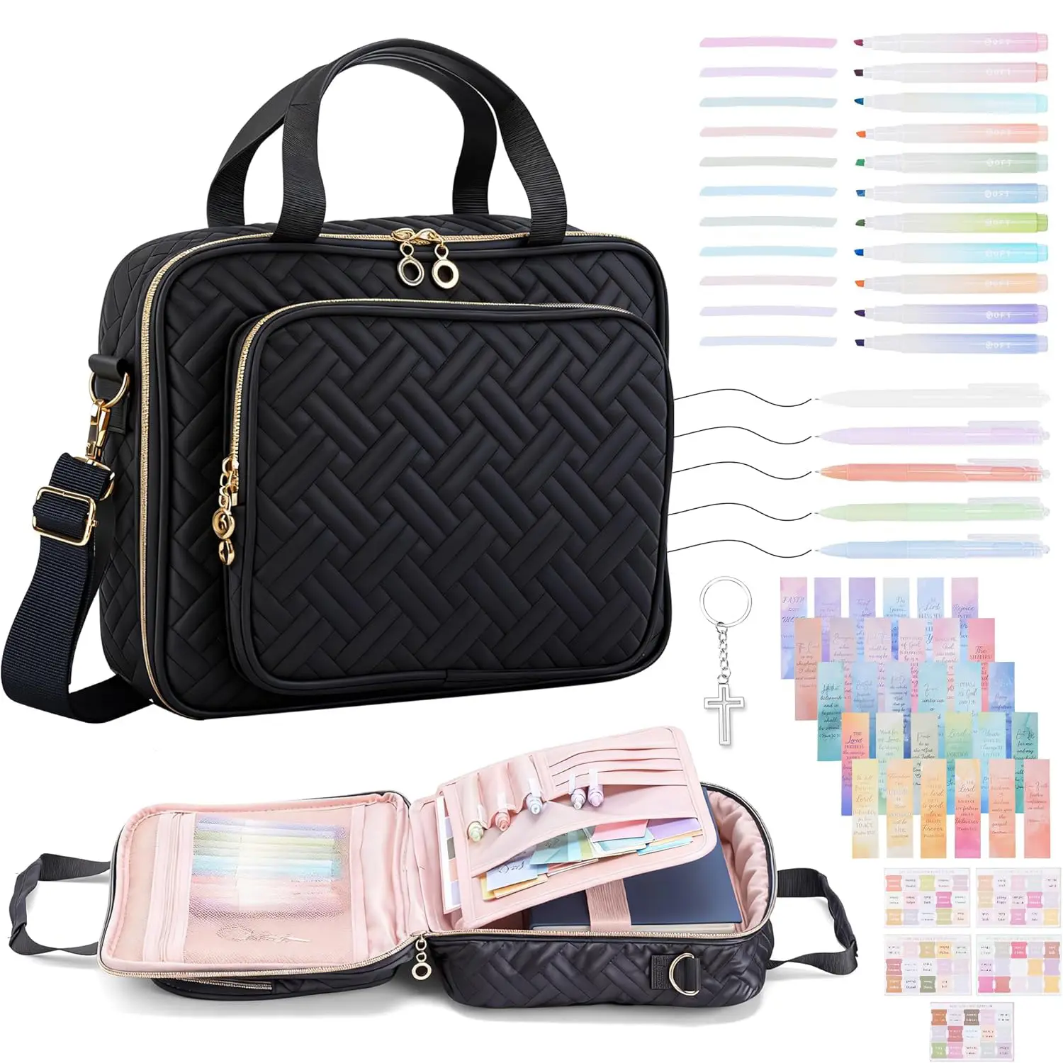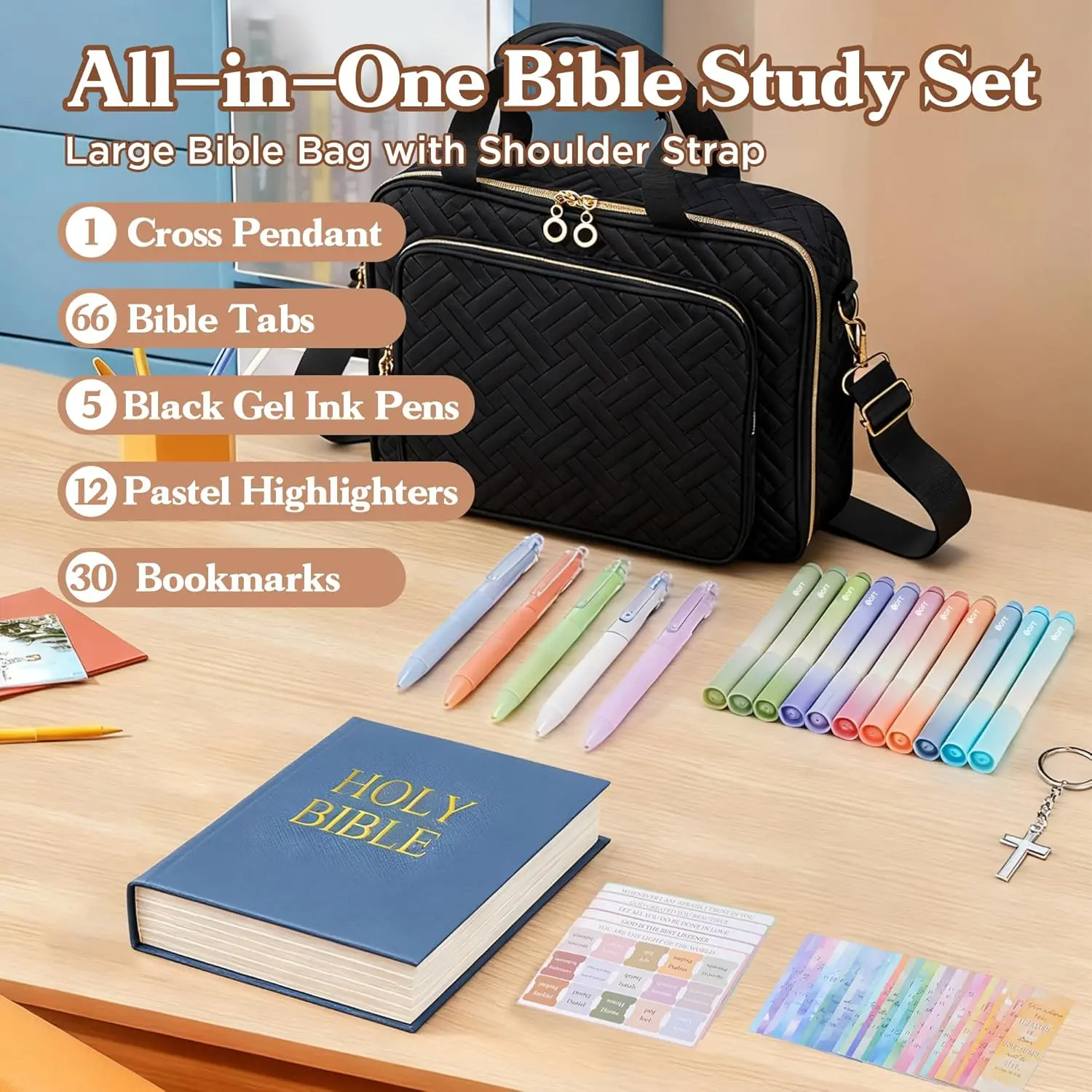 ·【Complete Bible Study Kit for Women】This all-in-one bible study kit includes everything you need for effective Bible study: 1 large bible bag, 12 non-bleed highlighters, 5 gel pens, 66 Bible tabs, 30 bookmarks, and a cross pendant. Perfect as a bible journaling kit and for organizing your bible study supplies.