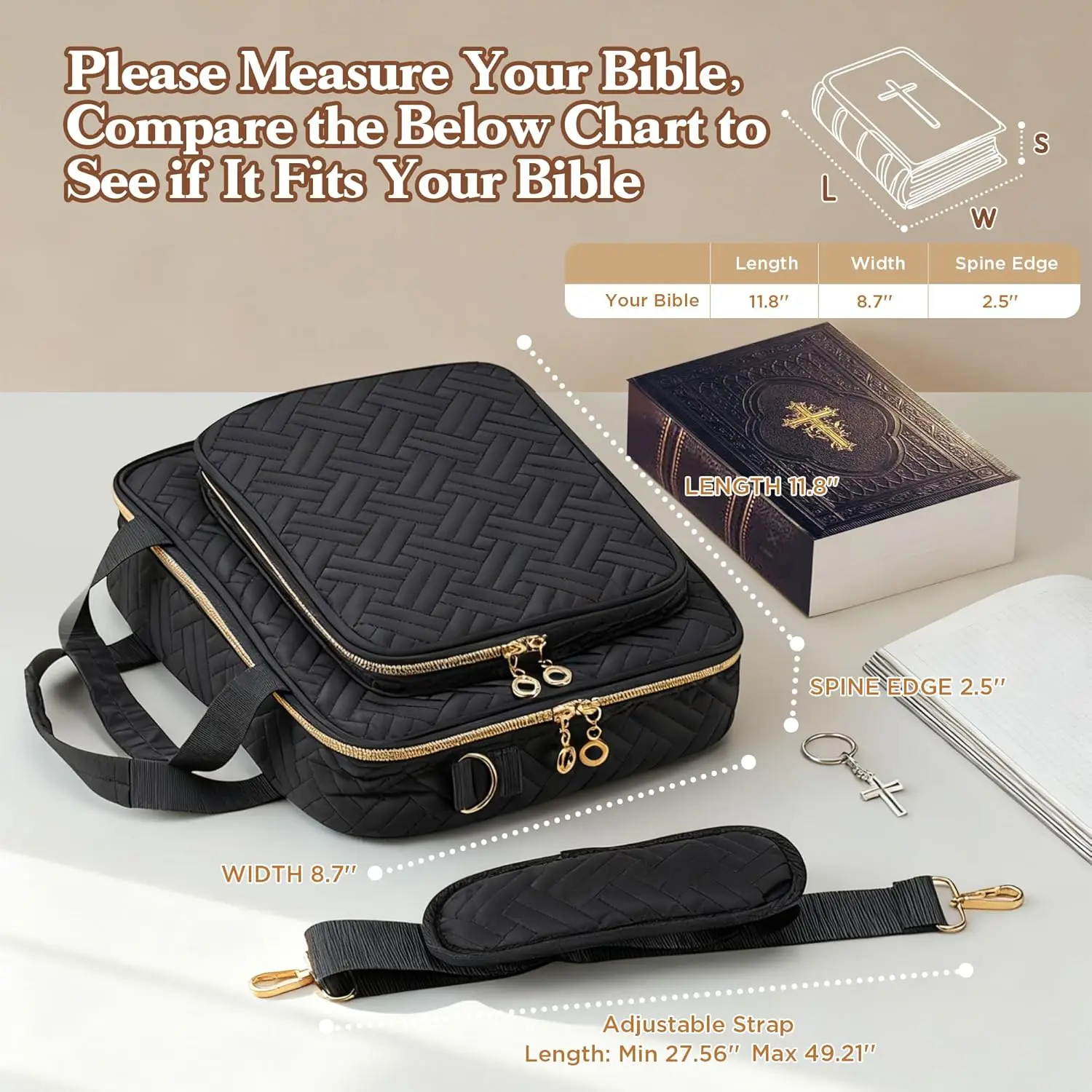 ·【Durable & Multi-Functional Design】Made with premium waterproof quilted cotton and metal zippers, this bible cover case is built to last. The ergonomic removable shoulder strap allows multiple carrying styles—handbag, shoulder bag, or crossbody. Use it as a bible bag, bible carrying case for women, bible cases for woman, or even as a Bible study tote for church, school, or library.