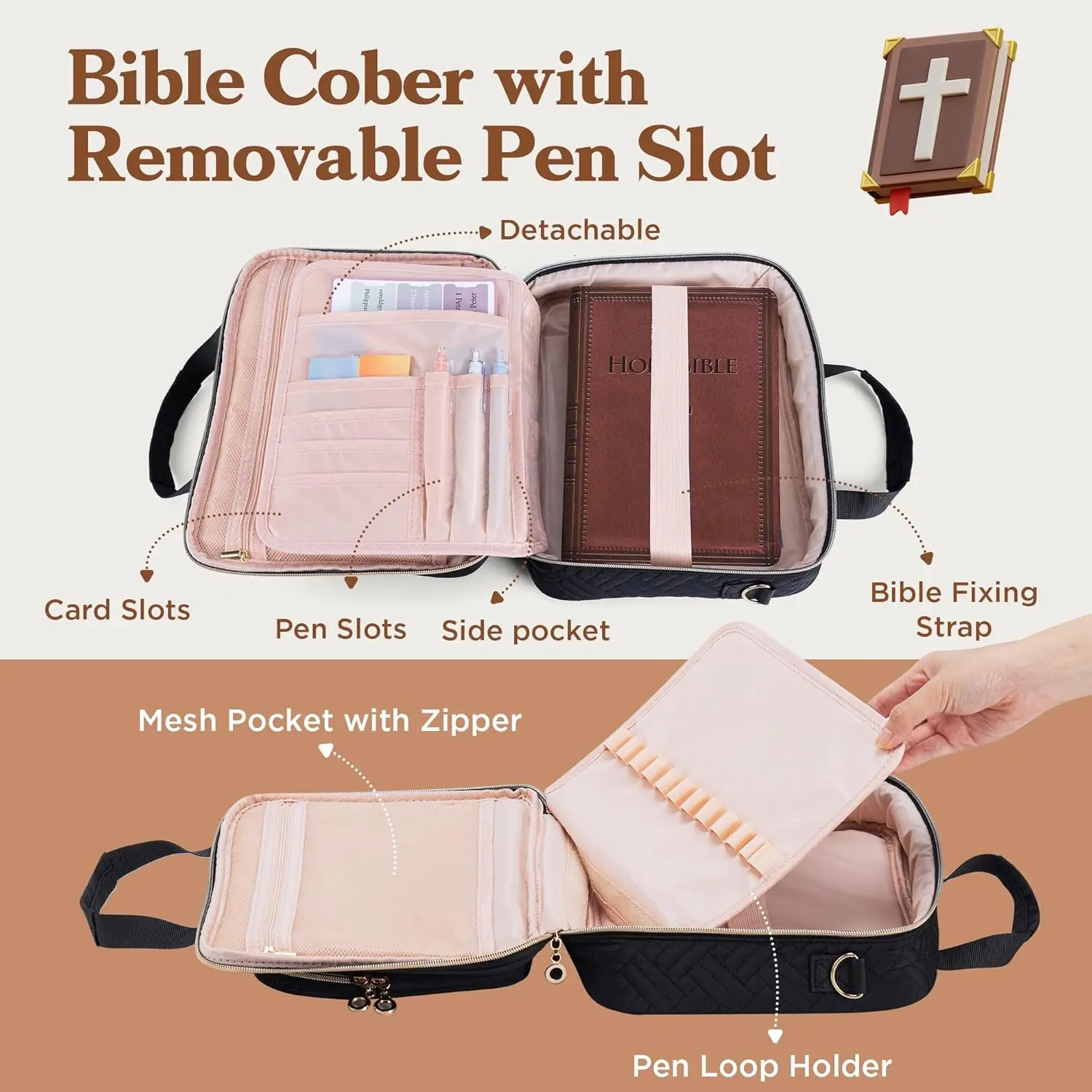 ·【Spacious Bible Bag & Organizer】Our large bible bag (11.8" x 8.7" x 2.5") fits both NIV and ESV Bibles. This versatile bible cover case for women includes multiple compartments and a removable pen holder, allowing you to neatly store up to 15 pens, cards, bookmarks, or other accessories. Ideal as a bible carrying case for women, bible bags for women organizer, or bible study bag.