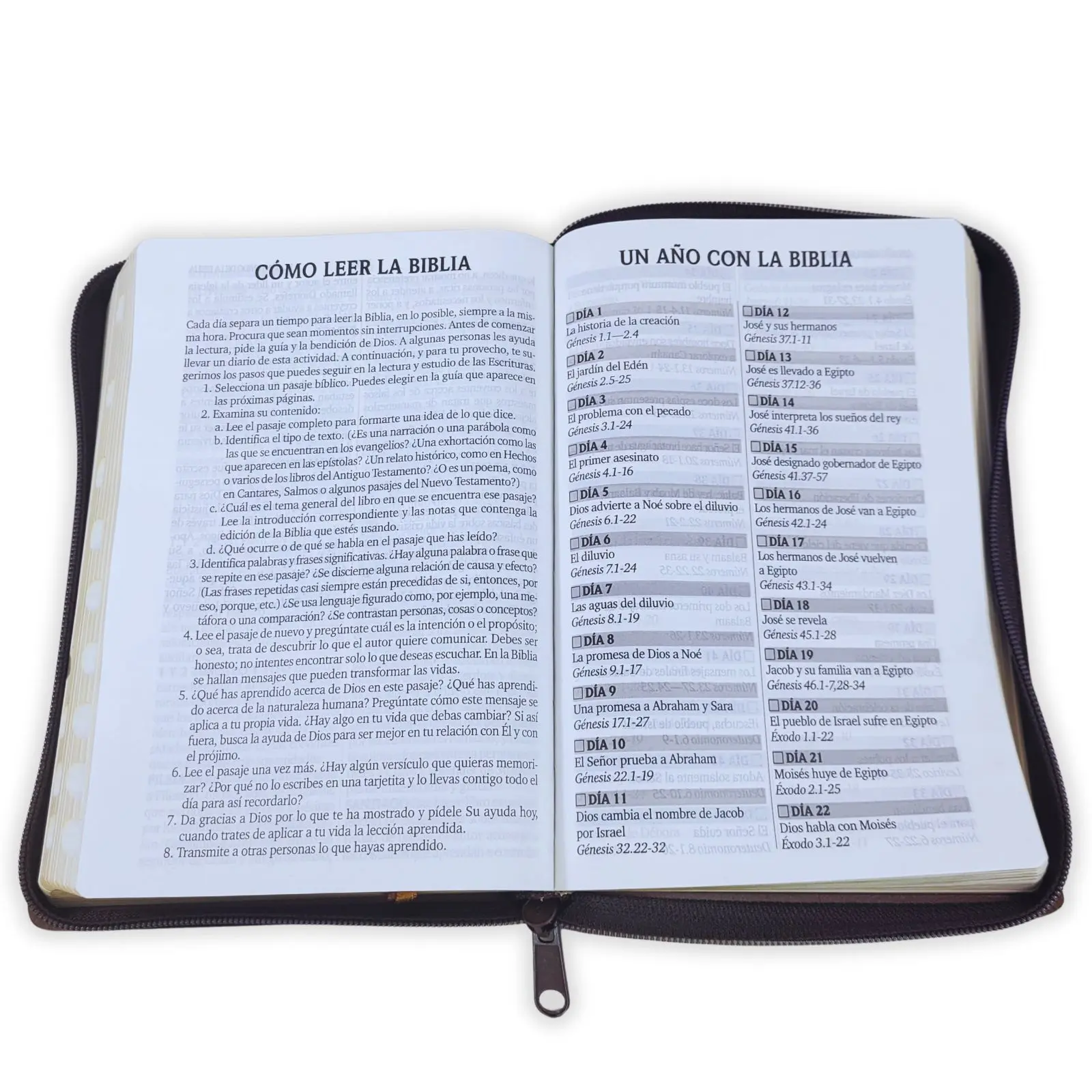 Tamaño de letra de 12 puntos La traducción de la Biblia más leída en español con un tamaño de letra fácil de leer y con dimensiones perfectas para llevar la Santa Escritura a donde quiera que vaya. Su tiempo leyendo y profundizando en el mensaje de la Palabra de Dios, se verá beneficiado con las excelentes ayudas adicionales incluidas en esta práctica edición: Características: - Palabras de Cristo en rojo - Concordancia extensa de 300 páginas - Plan para leer la Biblia en un año - Lecturas para días especiales - Pasajes famosos de la Biblia - Canciones en la Biblia - Oraciones en la Biblia - Cómo encontrar ayuda en la Biblia - Lo que dice la Biblia acerca del perdón de Dios - Página de presentación/sección de registro familiar. - Tabla de pesos y medidas