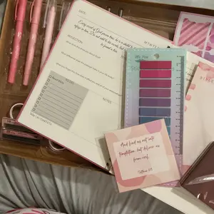 Absolutely love this set! 💖 Everything is beautifully coordinated in pink and perfect for Bible journaling. The pens write smoothly without bleeding through pages, and the variety of stickers, washi tape, and highlighters make studying and note-taking so much more creative and fun!✝️