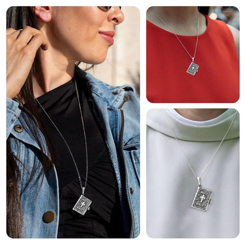 Keep your faith close with this Openable Holy Bible Pendant Necklace, a timeless piece of Christian jewelry designed for both men and women. This unique Bible cross necklace for women or cross necklace for men keeps a symbol of devotion near your heart, offering comfort and inspiration. Crafted from 925 sterling silver, the Bible jewelry pendant cross necklaces for women blend style with spiritual significance.