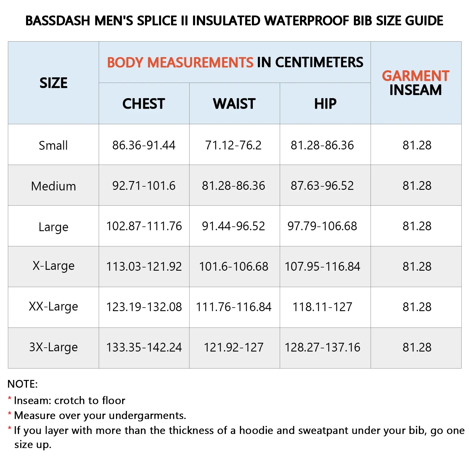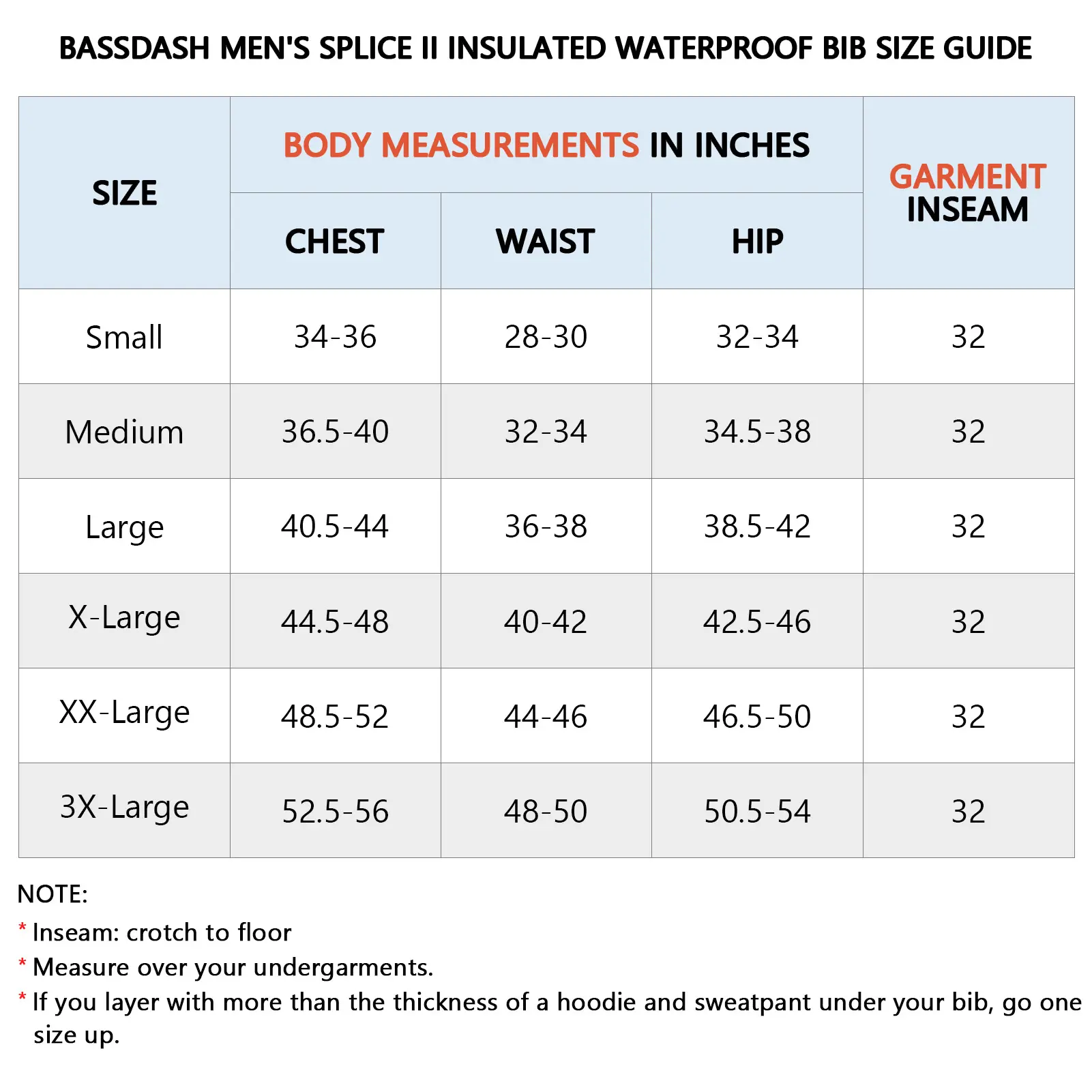 Perfect for hunting, winter fishing, skiing, snowmobiling, etc. EASY CARE: machine washable. Available in sizes S–3XL and waist measurements in inches: S (28–30), M (32–34), L (36–38), XL (40–42), 2XL (44–46), and 3XL (48–50)