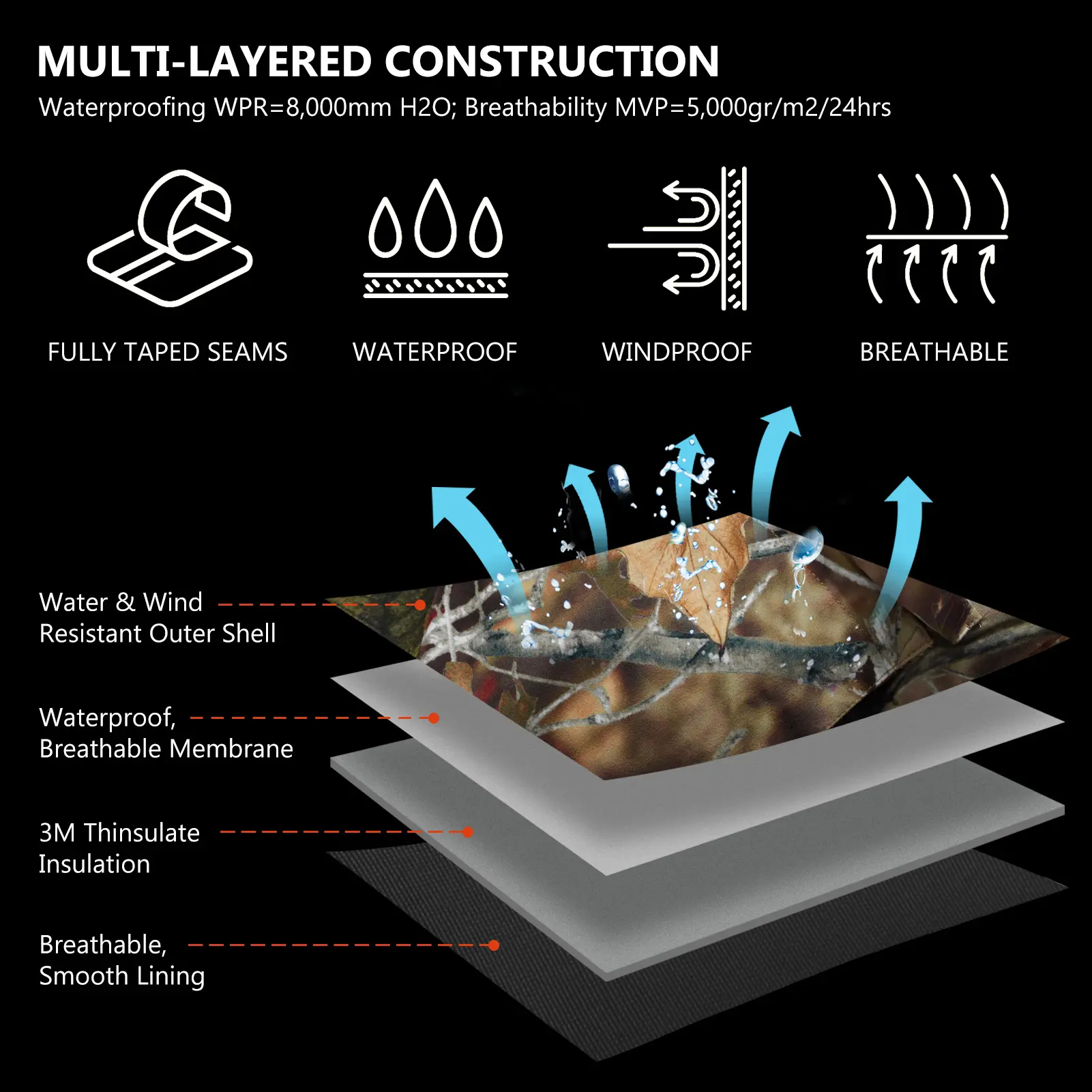 Multi-layered construction - Durable ripstop outer layer fabric resists thorns; Waterproof, breathable inner membrane and sealed seams ensure 100% watertightness; 3M Thinsulate Insulation; With skin-friendly lining