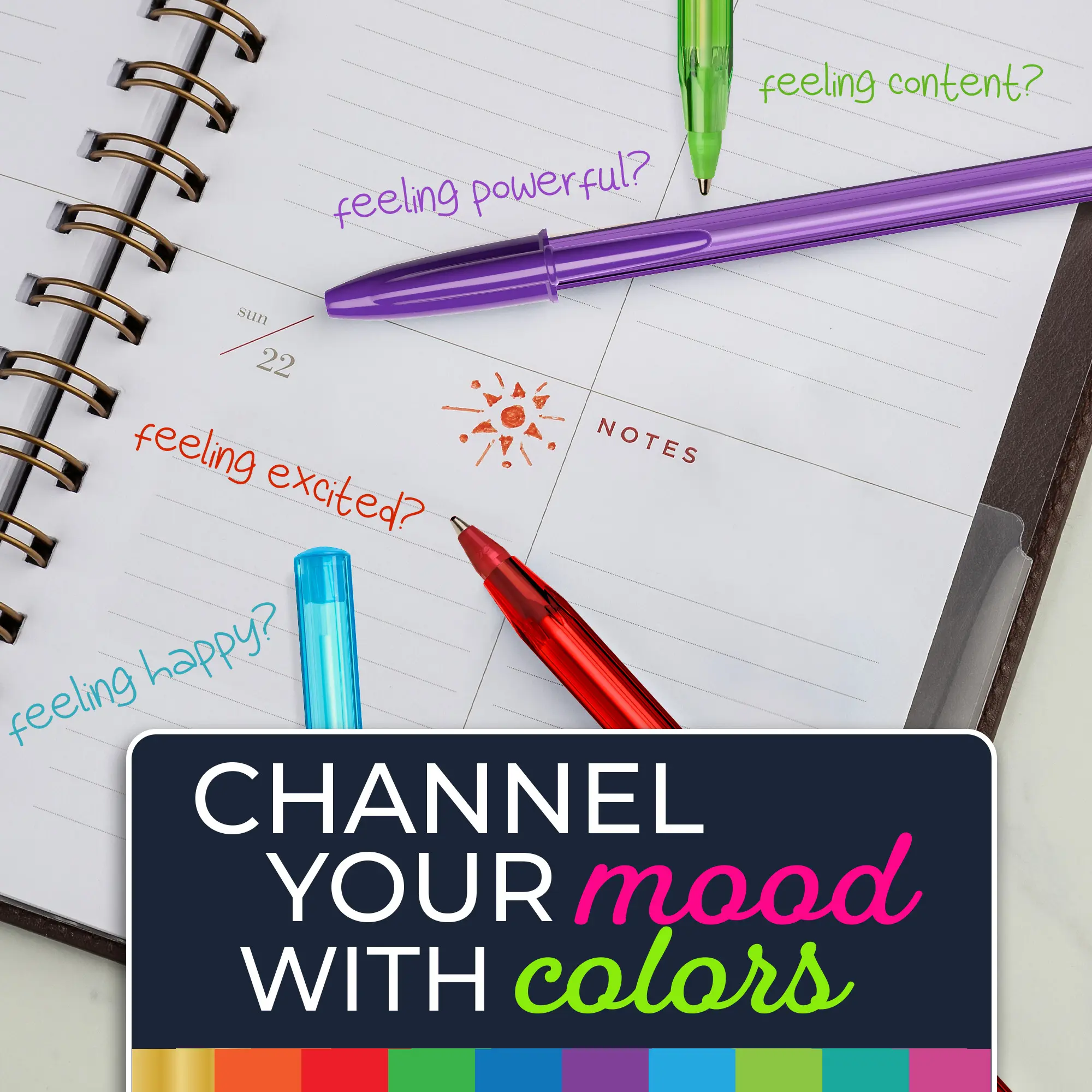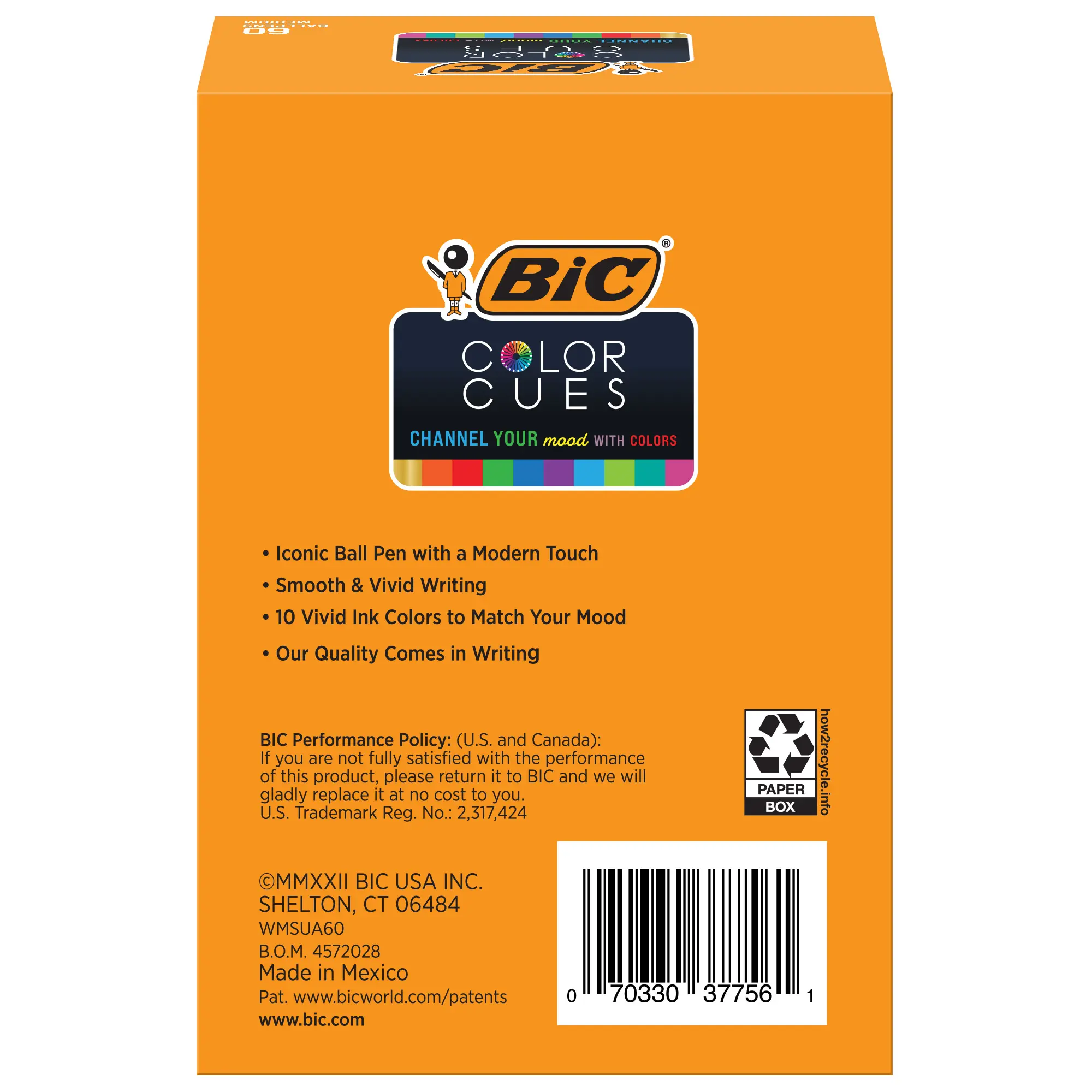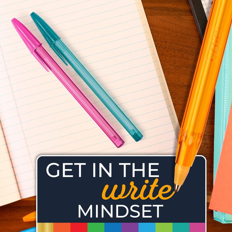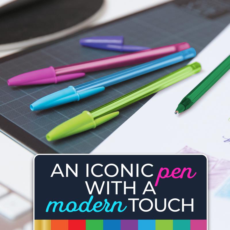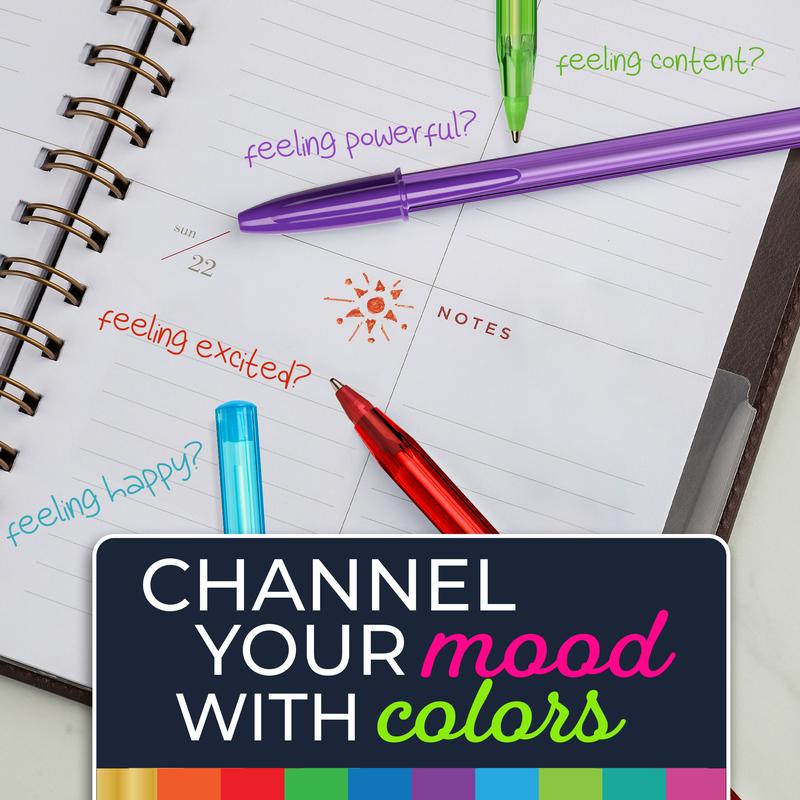 Colors are known to affect our mood, so BIC created the Color Cues line to give students a constant positive boost with extra cheerful colorful inks. With barrels and caps to match, they come in 10 vividly happy colors for limitless self-expression: blue, red, green, lime green, purple, pink, turquoise, orange, gold, and teal. This pack of Color Cues pens includes the legendary BIC Cristal ball pen, the world's best-selling pen. It makes writing and drawing more uplifting than ever, especially since the iconic ballpoint also offers the pleasure of effortlessly smooth handling. The ultimate in frustration-free writing, it has a medium 1.2 mm point perfect for any activity that calls for a ball pen. Tweens and teens love BIC Cristal Color Cues for therapeutic activities such as journaling, drawing, writing poetry or just doodling. So, take a cue from the timeless BIC Cristal pen, now in colors that will make everyone smile – complete with the BIC quality and value you expect.