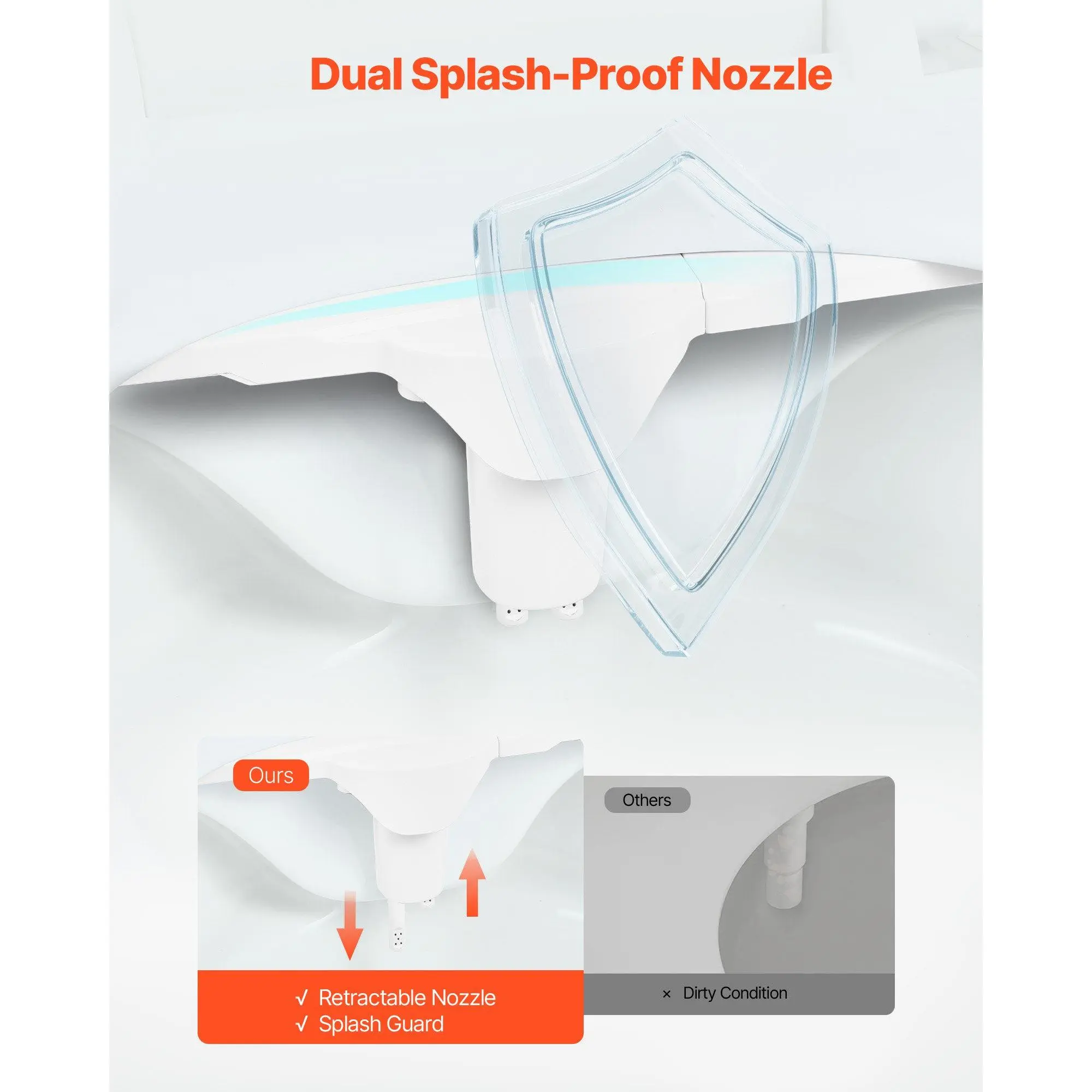 Dual Cleaning Modes: This dual nozzle bidet attachment offers separate feminine and rear wash functions, designed to meet different cleaning needs, especially gentle care for pregnant users and those during their period.Retractable Nozzle: The toilet bidet attachment features a retractable nozzle and a splash guard.The nozzle automatically returns behind the splash guard when not in use, keeping it clean and preventing splash-back or dirt.Seamless Installation: With a sleek 0.3-inch thickness, this bidet attachment for toilet installs flush without gaps, blending easily into most toilets and complementing modern bathroom styles.Adjustable Water Pressure: This toilet seat bidet attachment lets you adjust the spray from soft to strong with a simple twist of the knob, making it easy and comfortable for both kids and seniors.Easy Installation: This bidet attachment for toilet is crafted from durable ABS, a solid brass T-adapter, and a stainless steel hose.Corrosion-resistant and compatible with most standard toilets-install in minutes without replacing your setup.VEVOR Bidet Attachment for Toilet, 0.3" Ultra Thin Bidet Toilet Seat Attachment - Dual Retractable Nozzles, Adjustable Water Pressure, Non-Electric Cold Water Sprayer for Front Rear Water Wash, White