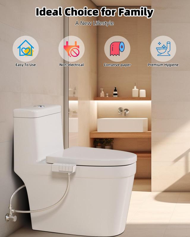 ·Mechanical Bidet for your Toilet: With Hibbent toilet seat bidet, replace the paper rolls with this small and mechanical attachment which is portable and space friendly for your toilet. Constructed of quality ABS plastic, braided stainless steel hose for refreshing cold water and sturdy brass T-valve for long-lasting property.