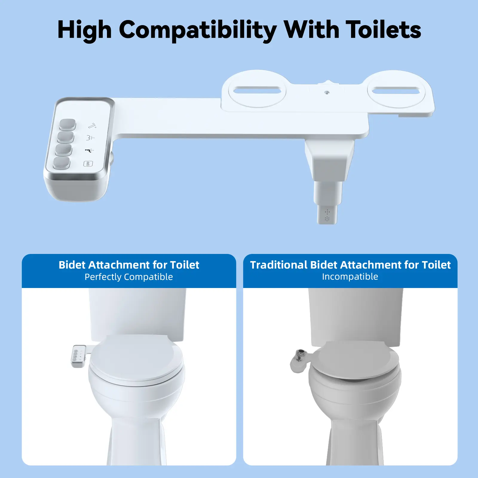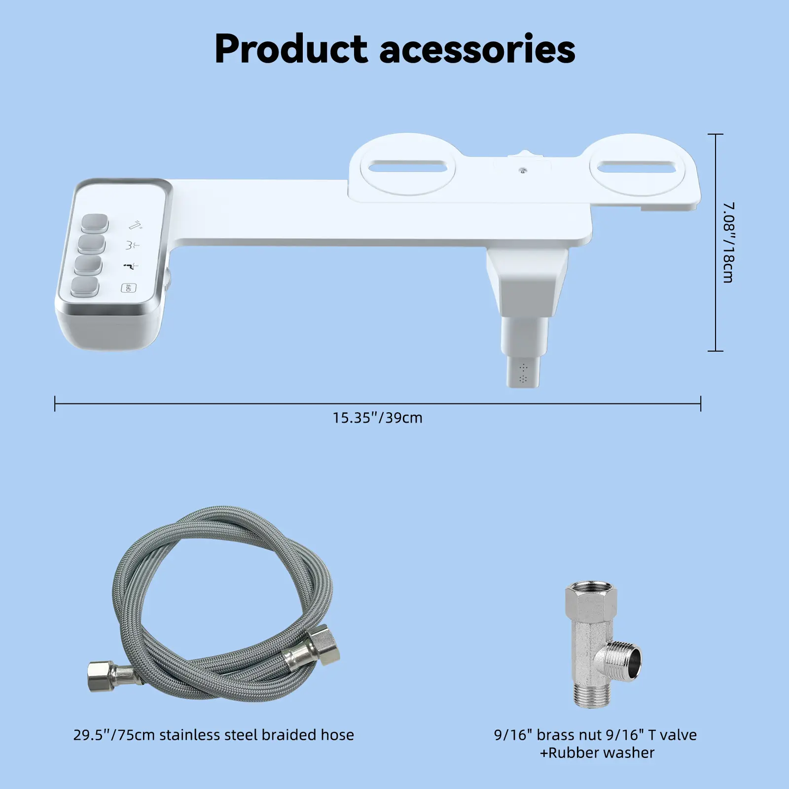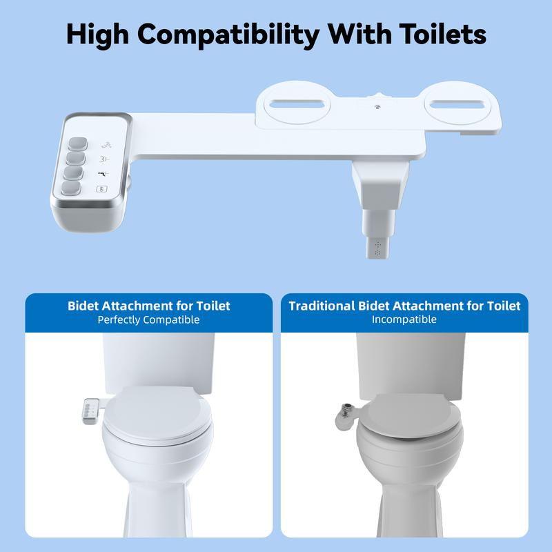 Easy Installation with All Required Components: bidet attachment for toilet contains bidet body x 1, 29.5 inch stainless steel braided hose x 1, 9/16''-9/16''-9/16'' (3/8''-3/8''-3/8'') T-adapter x 1, rubber washers, and instruction x 1. It only takes several minutes to install. The bidet requires no special tools, and you can easily mounts it under the toilet seat lid in minutes. No plumbers are needed. Our Bidet Attachment is not compatible with one-piece toilets and RV toilets. Please check before placing your order.