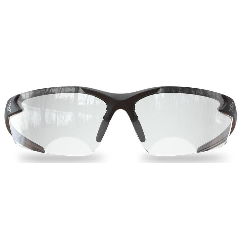 The Edge Zorge G2 Reader features a lightweight half-frame design, ideal for various activities. Its flexible black frame includes soft thermoplastic rubber nose pads and temple arms for a comfortable, nonslip fit. The durable polycarbonate lenses have built-in bifocals in +1.50, +2.00, and +2.50 diopter strengths.
