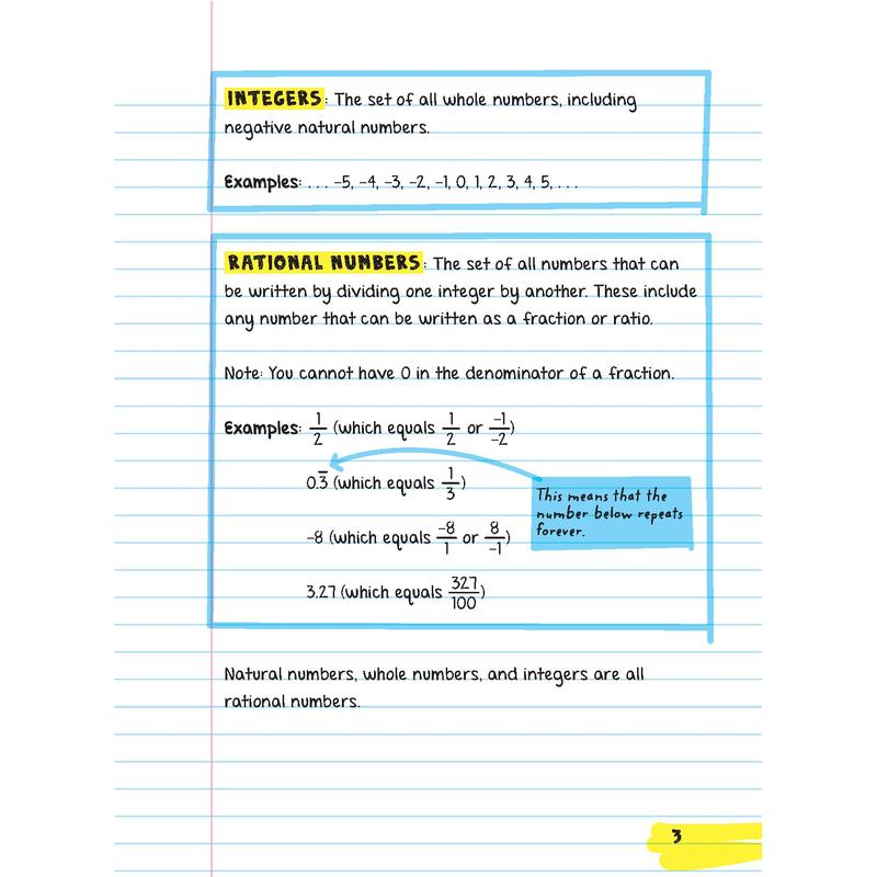 The BIG FAT NOTEBOOK covers everything you need to know during a year of Pre-Algebra and Algebra 1 class, breaking down one big fat subject into accessible units. Including: The number system, ratios, and proportions, scientific notation, introduction and equations, functions, graphing a line, square roots and cube roots, polynomial operations, quadratic functions, and more.
