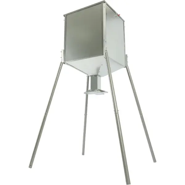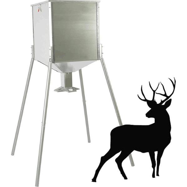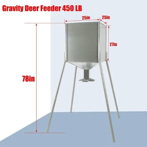 ·450LB Deer Feeder: Weight: 73lbs. Box Size: 30.12" x 27.17" x 5.51". Hopper Size: 25" x 25" x 27". This deer feeder is made from durable steel to withstand outdoor conditions. The galvanized surface ensures long-lasting rust protection and is suitable for long-term outdoor use.