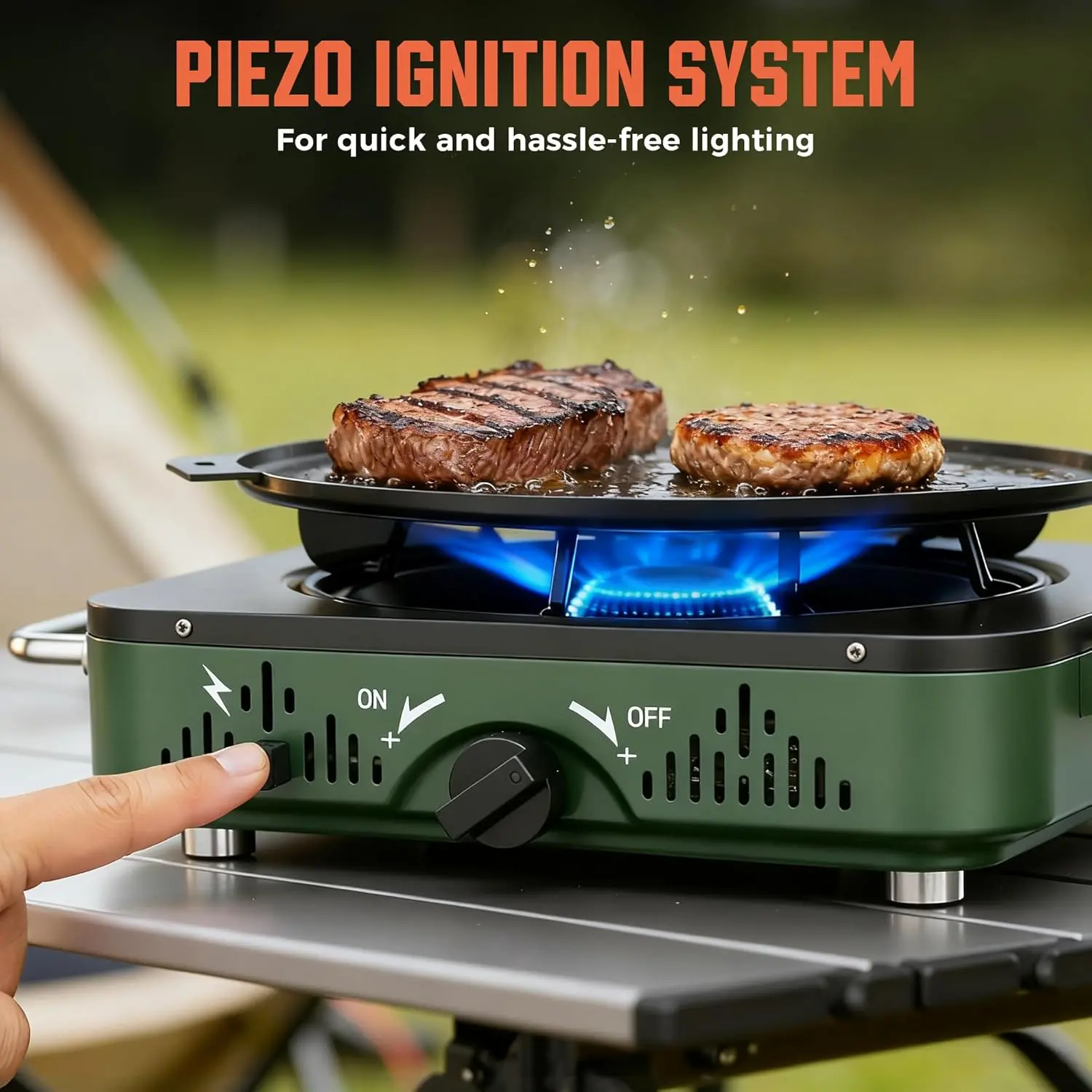 ·【User-Friendly Design】 Equipped with a convenient piezo electric ignition system, this propane stove for camping allows for quick and hassle-free lighting with just a single button press, and the flame-free ignition enhances safety for worry-free cooking, suitable for beginner. Plus, the camp stove is compatible for propane only