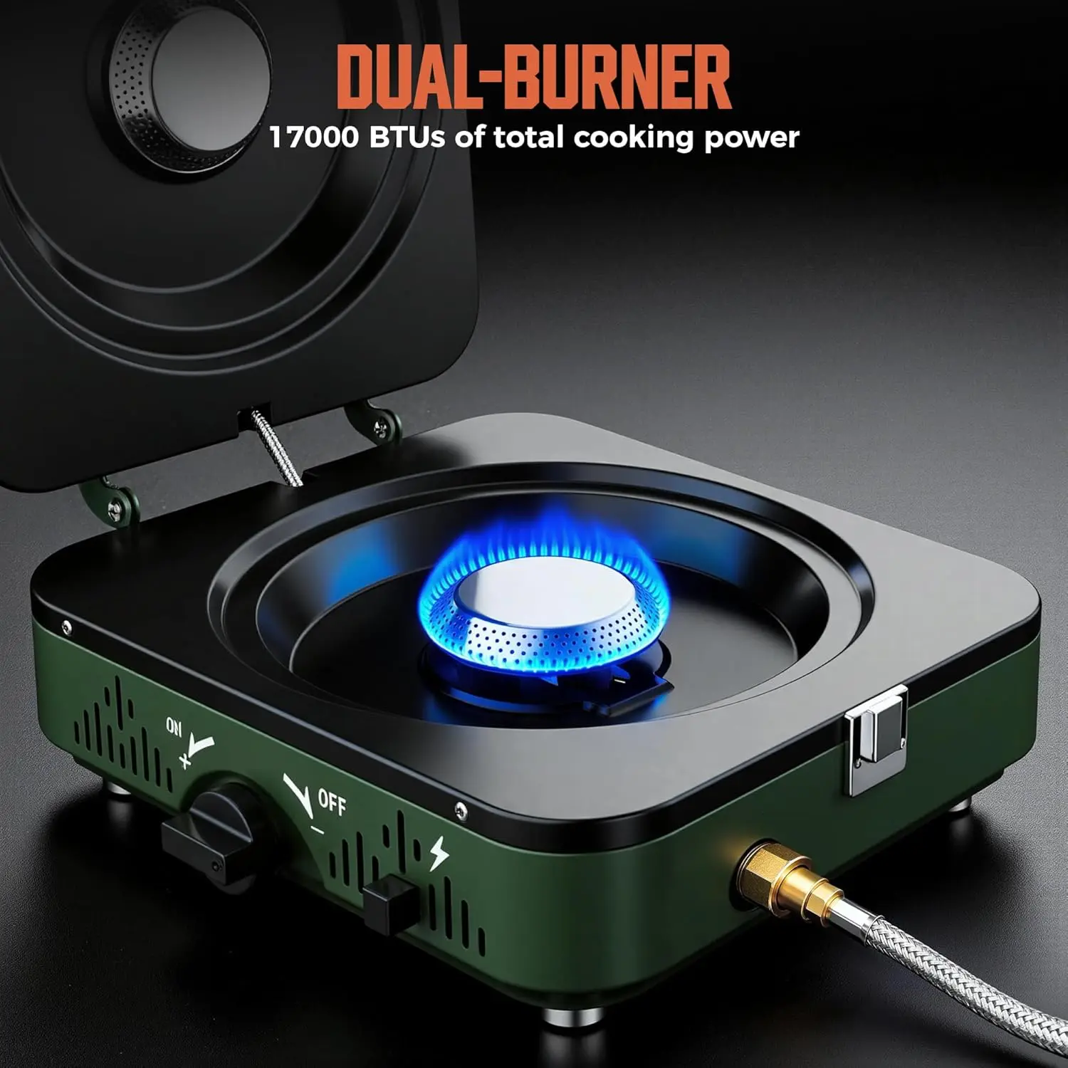 ·【Safety Design】 Crafted with a robust and corrosion resistance shell, which made of iron with high-temperature painted, and the camp stove propane equipped with anti-slip feet, anti-leak connectors, and flame-retardant hose fittings provide peace of mind—even on uneven or windy terrain