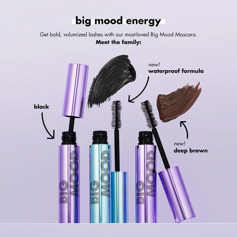 Bring the drama and the #BigMoodEnergy—our best-selling Big Mood Mascara is now available in a waterproof formula! This volumizing and lifting mascara gives you that extra-bold and defined false lash effect. The hourglass brush head's intertwined bristles separate and define lashes while loading on the waterproof pigment. The smudge and flake-resistant formula will give you a smooth, effortless application every time.