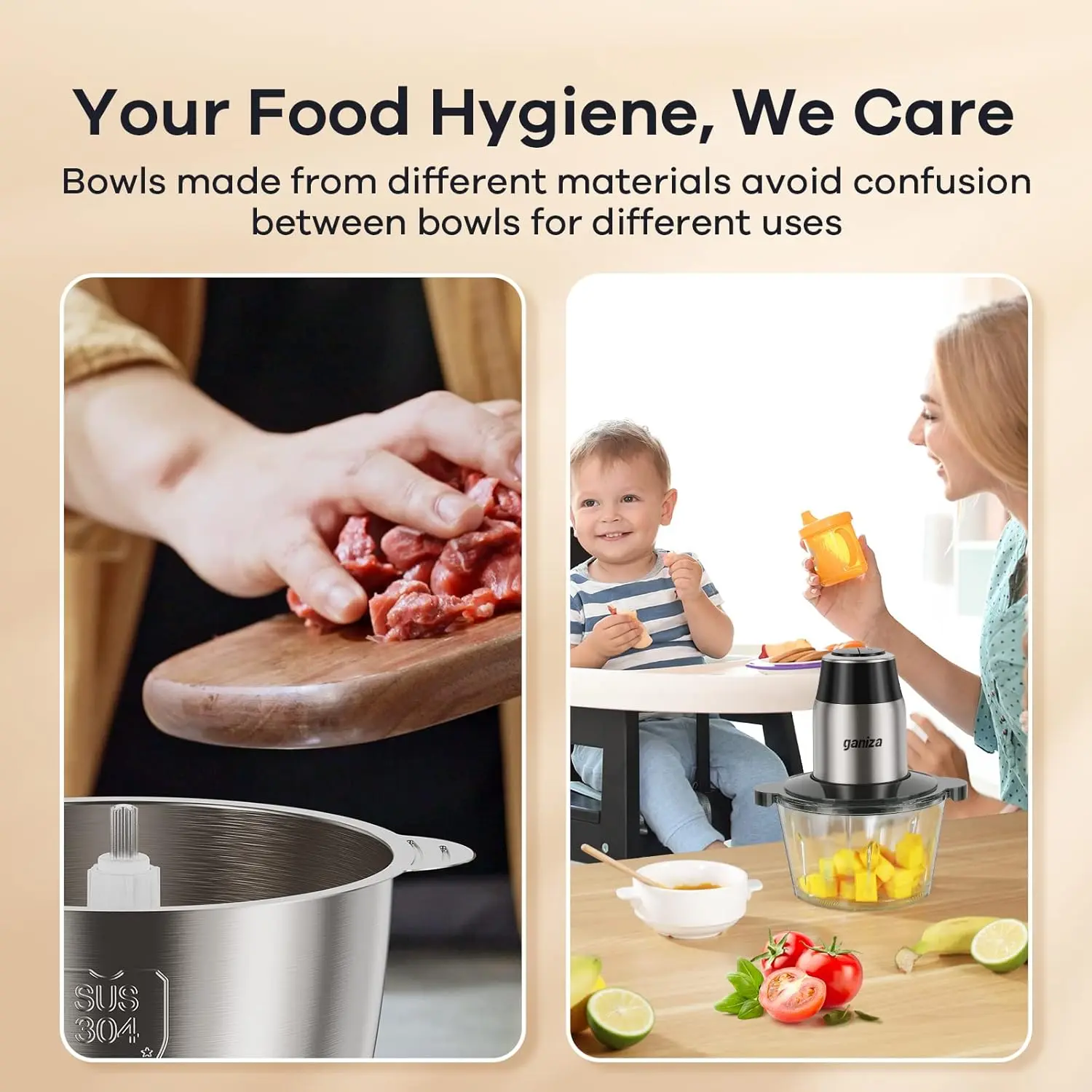 The GANIZA Food Processor & Meat Grinder is a versatile and efficient kitchen tool, designed for easy use and safe operation. With its powerful motor, dual bowls, and safety features, it is perfect for handling a variety of kitchen tasks.