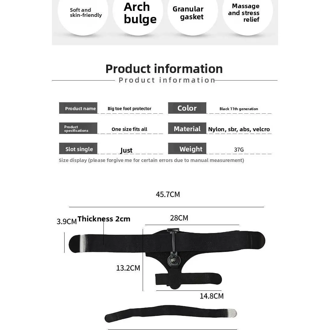 A specialized bunion corrector designed to alleviate hallux valgus discomfort. Features an adjustable hook-and-loop strap for a customized fit and a sturdy ABS support bracket for effective toe alignment. Its soft, skin-friendly material ensures all-day comfort, while the cushioned arch support and massage particles stimulate pressure points to improve circulation. The raised pad gently separates toes, reducing friction and pain. This lightweight guard provides reliable stability, helping you walk naturally while correcting toe position. Ideal for daily wear, it combines therapeutic relief with ergonomic design for healthier, happier feet.