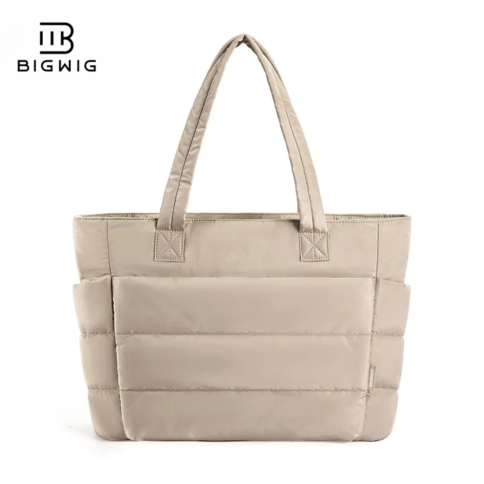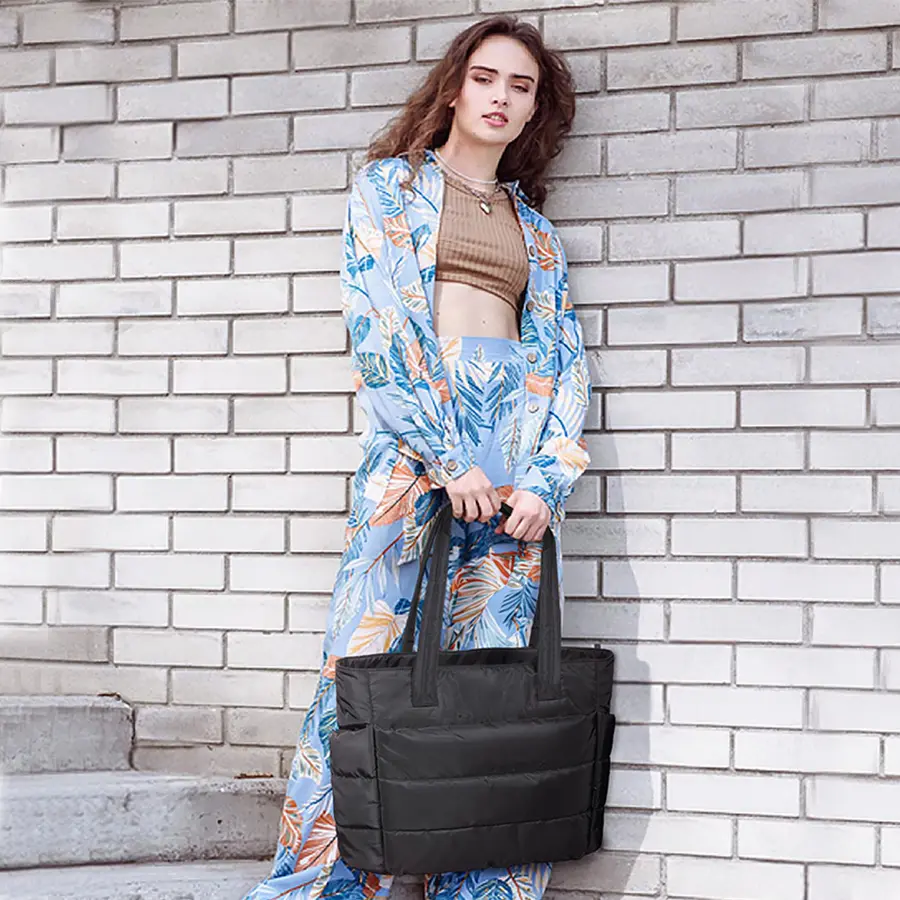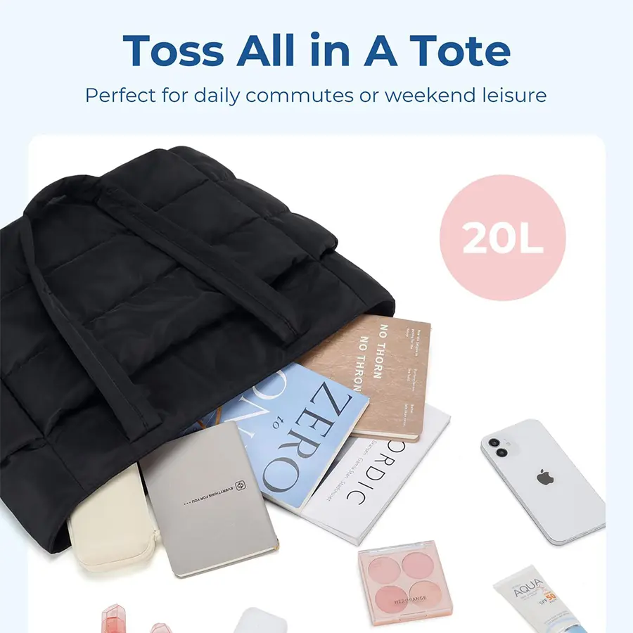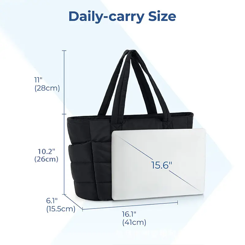 Compact Size: Standard Dimensions: 16.1" L x 6.1" W x 12.2" H. Slim Dimensions: 13.2" L x 5.1" W x 15.7" H. With a capacity of 20 liters, this quilted tote bag is suitable for storing daily essentials such as a 15.6-inch laptop, an umbrella, a water bottle, a power bank, clothing, shoes, and more. The zipper closure ensures security.
