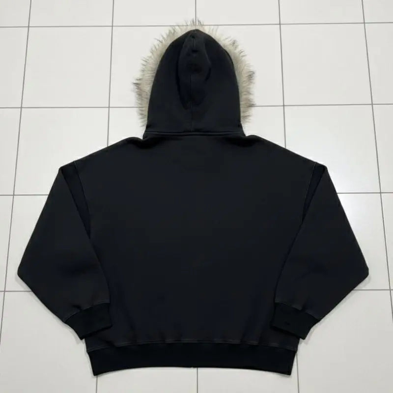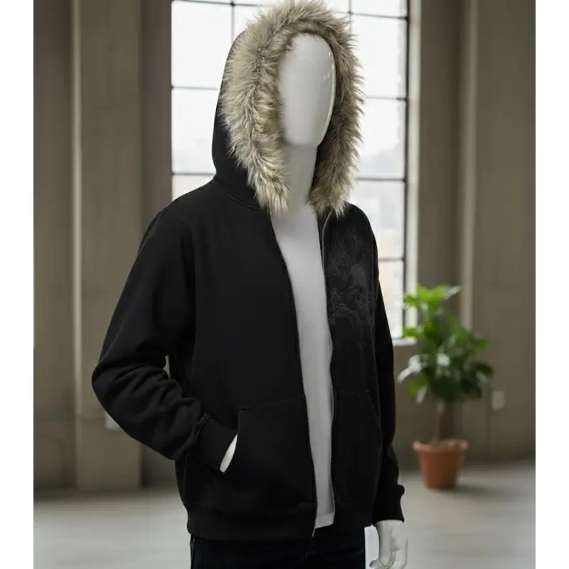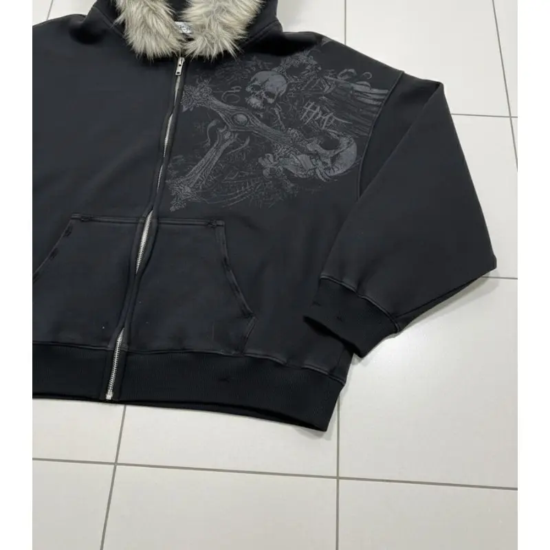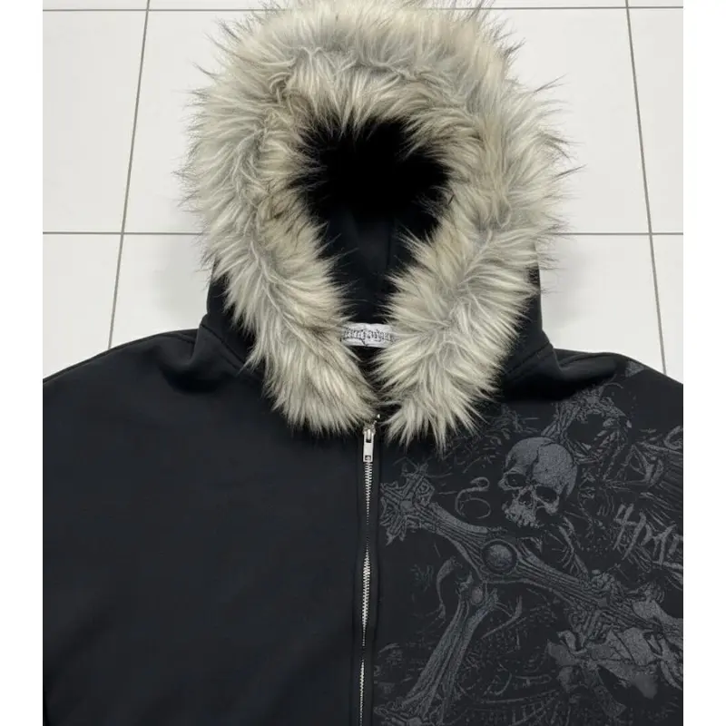BIGWIG Black zip-up hooded jacket with faux fur - unisex street gothic style SpringStatements