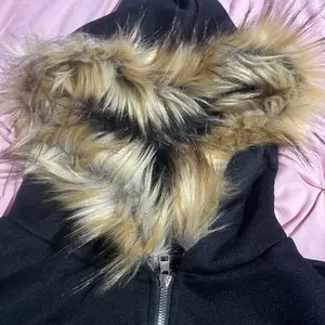 General description: Embrace bold style with this black zip-up hooded jacket, featuring a faux fur collar for a stylish and unique touch. Perfect for a street/gothic/alternative look, this unisex piece pairs just as well with black jeans as it does with more daring outfits.