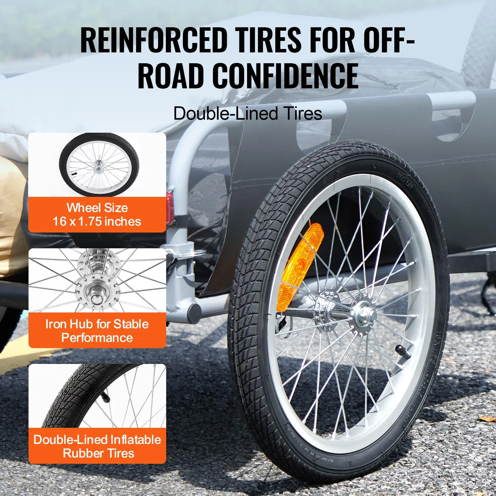 • Professional Tire Design: Roll smoothly on any road! Our bike trailer comes equipped with sporty 16" x 1.75" tires and iron hubs, providing excellent stability and traction on various surfaces, whether you're cruising on concrete, navigating gravel paths, or tackling sandy trails.