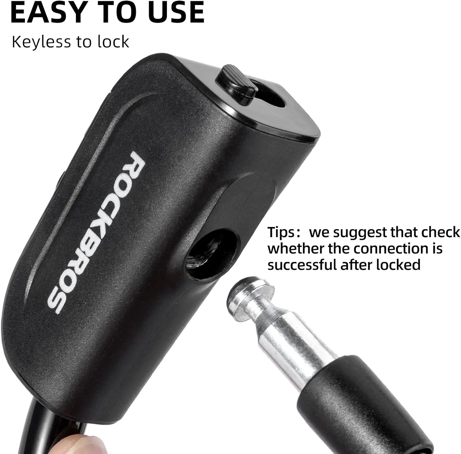·【ABS Lock Shell】Built with a durable ABS lock shell and a switchable cover, rockbros cable bike lock is waterproof and dustproof. Featuring a strong lock plug for easy operation, ensure a easy locking experience.