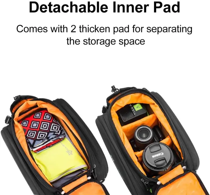 ·Compatible with Taillights & Water Bottle Holder: A spot in the rear bike rack bag to attach an tail light and high visibility stripes on the side, increase safety at night. Outside water bottle pocket with a cord to tighten which is helpful over rough roads. Come with a bright and reflective rain cover to throw over the whole bike bag.