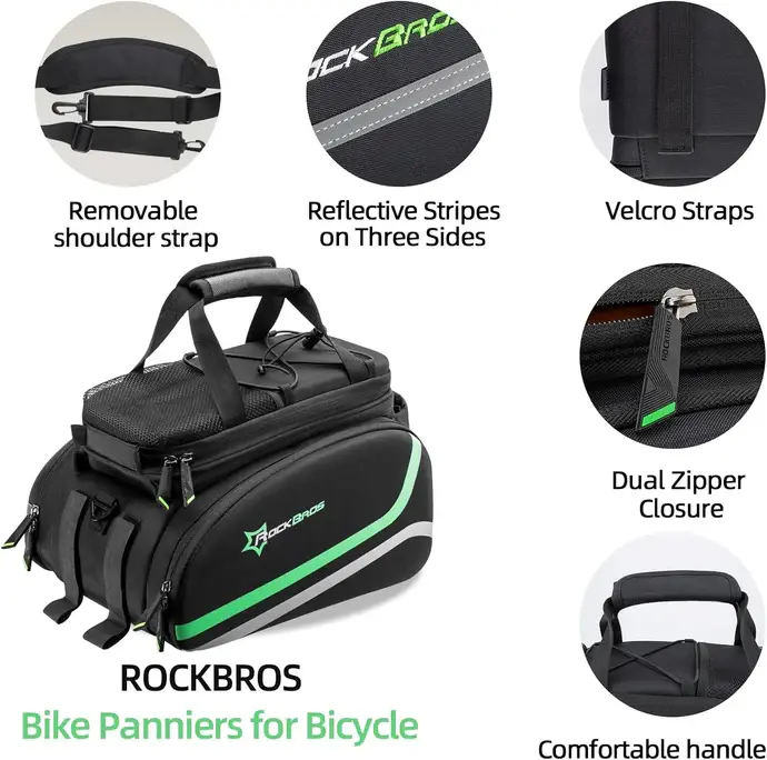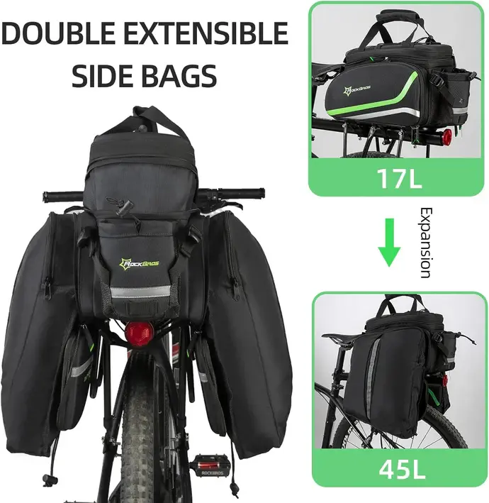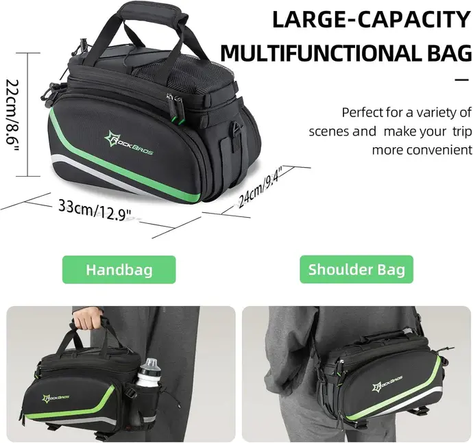 ·Versatile & Portable: Expandable double side bike panniers are hided by zippers and available when needed. You can unzip the expansion and fit clothes and shoes in the trunk bag. There are also shoulder and hand straps for carrying the rockbros bike bag with you.