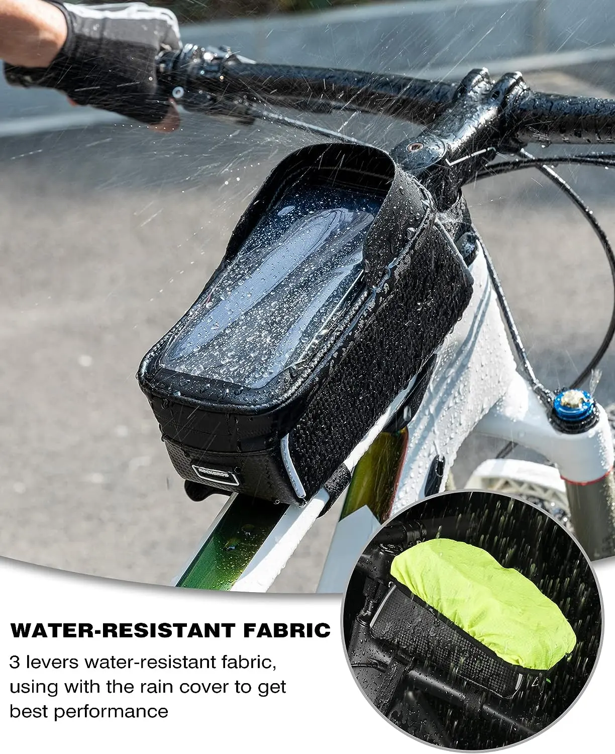 ·DURABLE & WATER RESISTANT: The bike top tube bag is made of Carbon fiber texture fabric with sealed double zippers closure, which ensures the water doesn't flow into the bag.The sun visor and flashing board is great use for rainy or sunny day
