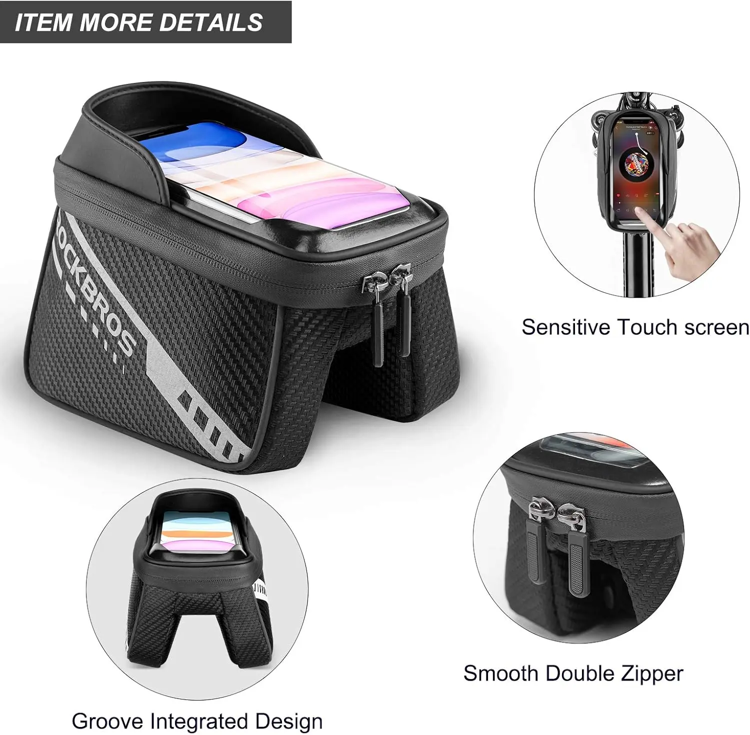·U-SHAPED SUN VISOR AND DUAL ZIPPERS:The bike top tube bag present a stylish appearance with exquisite twill weaving technology, smooth and seamless double zippers closure makes you use more convenient;What’s more, the sun visor and flashing board is great use for rainy or sunny day