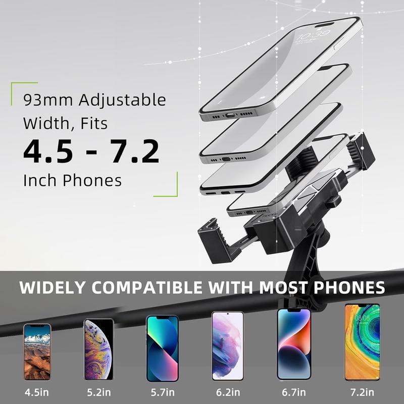 ·【Universal Compatibility】:Designed to fit a wide range of vehicles, this phone holder is compatible with most bikes, electric scooters, and motorcycles. Whether you ride on a mountain bike or a scooter, this motorcycle phone mount ensures a perfect fit for your phone between 4.5"-7.2" in size, offering broad compatibility for all major smartphone models.