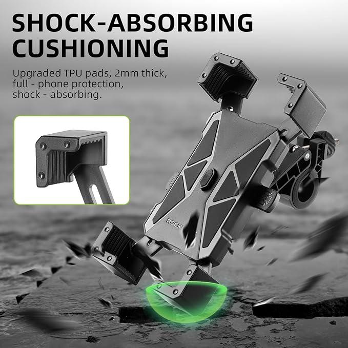 ·【Superior Shock Absorption】:ROCKBROS bike phone holder is equipped with high-quality TPU silicone cushioning that provides superior shock absorption. The four-point clamp evenly distributes pressure across the corners, ensuring that your phone stays securely in place while protecting it from bumps and vibrations on any terrain.