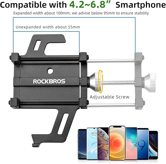 ·[UNIVERSAL FIT]: The width of cell phone holder can be adjusted from 55mm/2.16" to 100mm/3.93", works for smartphones between 4.2"~6.8". Compatible with iPhone 12, 12 Mini, 12 Pro Max, 11 Pro, 11 Pro Max Xs X 8 8P 7 7P 6S 6P, Huawei Mate 20 pro, Samsung S10 S9 S8 and etc.