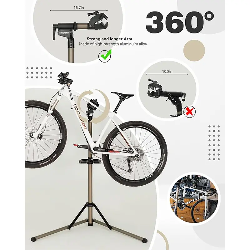 ·Ultra-Stable Clamping Technology: Equipped with a premium aluminum alloy frame and a high-strength nylon 360° rotating clamp, it secures your bike firmly like a robotic arm, enabling effortless repairs from any angle.